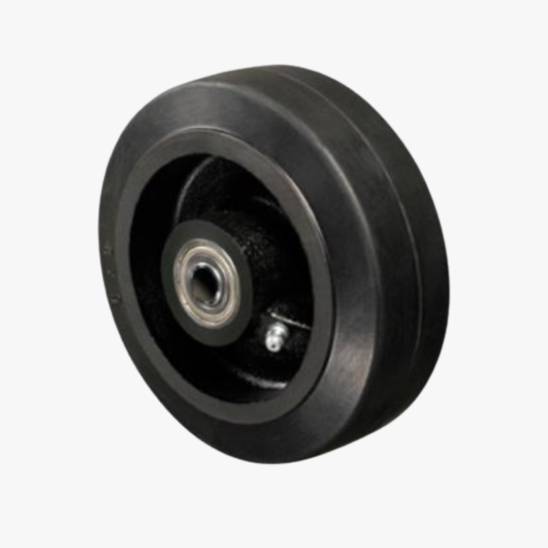 RODA B: Borracha Moldada. Dureza: 80 Shore A. (-20ºC e +70ºC). Produzidas com revestimento de borracha moldada vulcanizada em núcleo de ferro fundido cinzento. Rodam com suavidade e baixo nível de ruídos, absorvem choques e vibrações. São resistentes a abrasão e produtos químicos. Podem ser utilizadas em velocidades de até 20km/h quando montadas com rolamento de esferas.