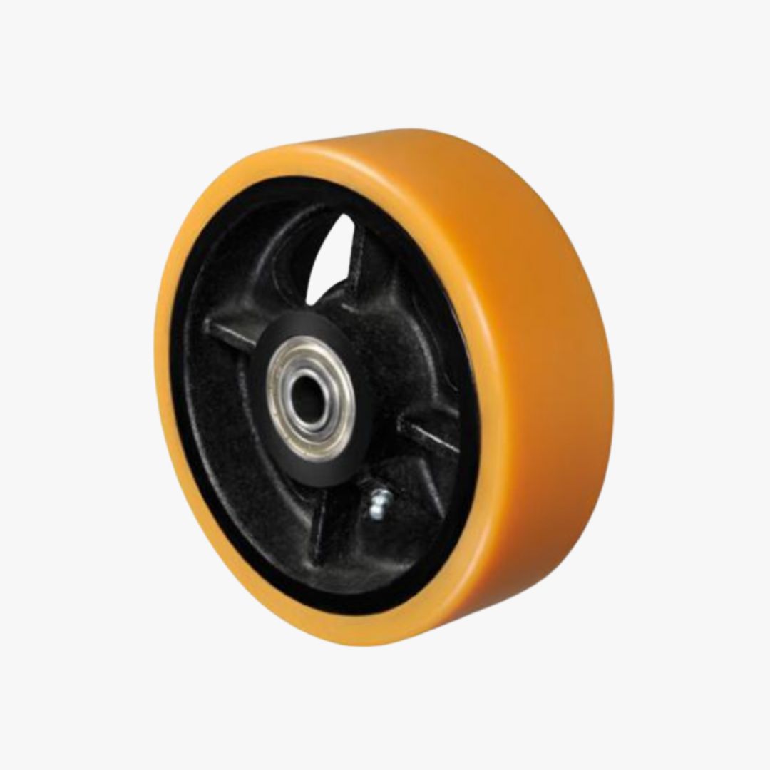 RODA P - Poliuretano Moldado. Dureza: 90 Shore A. (-40ºC a +80ºC). Produzidas com revestimento em poliuretano moldado e núcleo em ferro fundido cinzento. Ideais para aplicações nos mais diversos tipos de superfícies e ambientes. Suportam altas cargas, protegem o piso, necessitam de menor esforço para movimentação, produzem baixo nível de ruídos no deslocamento e têm excelente durabilidade. Possuem excelente resistência a abrasão, impactos, intempéries e produtos químicos como graxas, óleos, sais e solventes. Podem ser utilizadas a uma velocidade de até 20km/h quando montadas com rolamento de esferas.