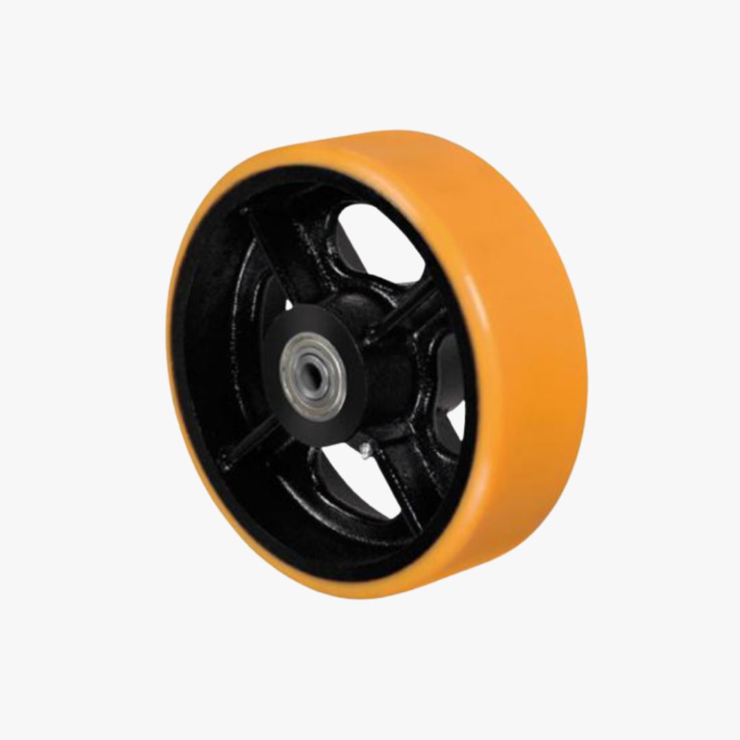 RODA P - Poliuretano Moldado. Dureza: 90 Shore A. (-40ºC a +80ºC). Produzidas com revestimento em poliuretano moldado e núcleo em ferro fundido cinzento. Ideais para aplicações nos mais diversos tipos de superfícies e ambientes. Suportam altas cargas, protegem o piso, necessitam de menor esforço para movimentação, produzem baixo nível de ruídos no deslocamento e têm excelente durabilidade. Possuem excelente resistência a abrasão, impactos, intempéries e produtos químicos como graxas, óleos, sais e solventes. Podem ser utilizadas a uma velocidade de até 20km/h quando montadas com rolamento de esferas.