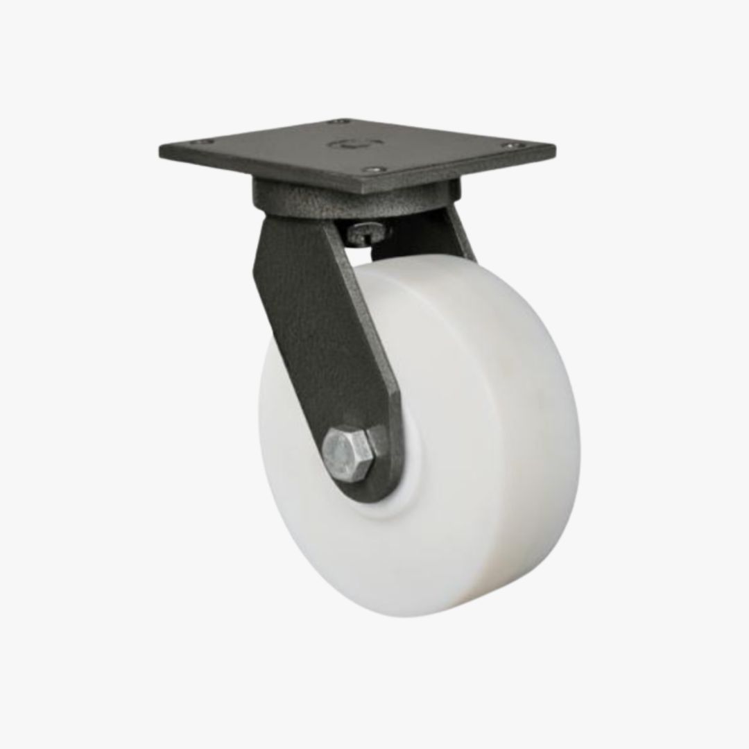 RODA NM - Nylon Maciço Usinado. Dureza: 70 Shore D. (– 40ºc a +110ºC). Produzidas a partir de tarugos de nylon 6.0. São leves, possuem ótima resistência mecânica, rodam com muita facilidade exigindo menor esforço para manobras e movimentações, não deformam sob carga estática. Suportam cargas leves e pesadas mantendo a facilidade para manuseio do equipamento. Ideal para aplicações em ambientes úmidos, são resistentes a produtos químicos, graxas, óleos, sais e alguns tipos de ácidos. A velocidade de trabalho indicada é até 4km/h.