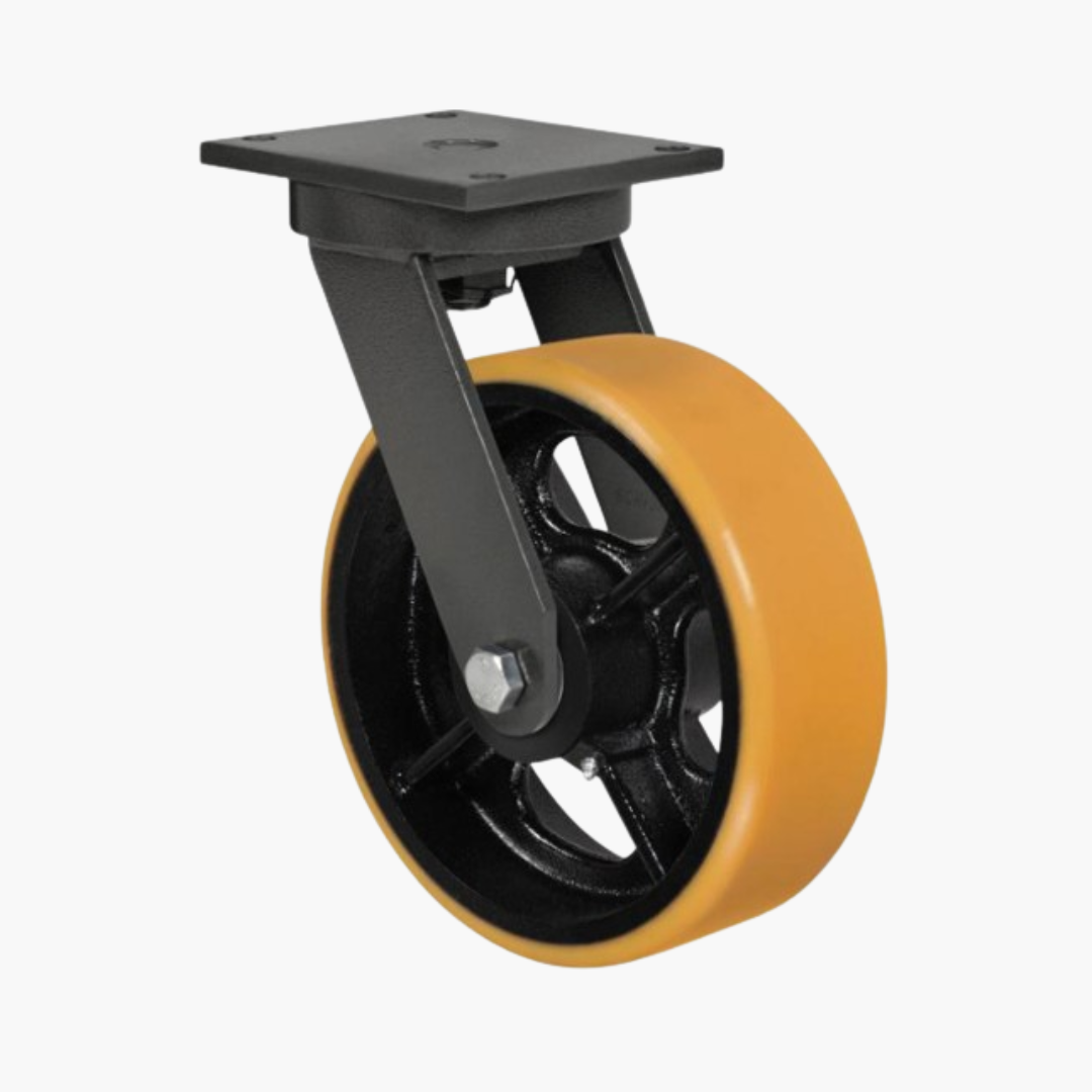 Roda P: Poliuretano Moldado. Dureza: 90 Shore A. (-40ºC a +80ºC). Produzidas com revestimento em poliuretano moldado e núcleo em ferro fundido cinzento. Ideais para diversos tipos de superfícies e ambientes. Suportam altas cargas, protegem o piso, necessitam de menor esforço para movimentação, produzem baixo nível de ruídos no deslocamento e têm excelente durabilidade. Possuem excelente resistência a abrasão, impactos, intempéries e produtos químicos como graxas, óleos, sais e solventes. Podem ser utilizadas até 20km/h quando montadas com rolamento de esferas.