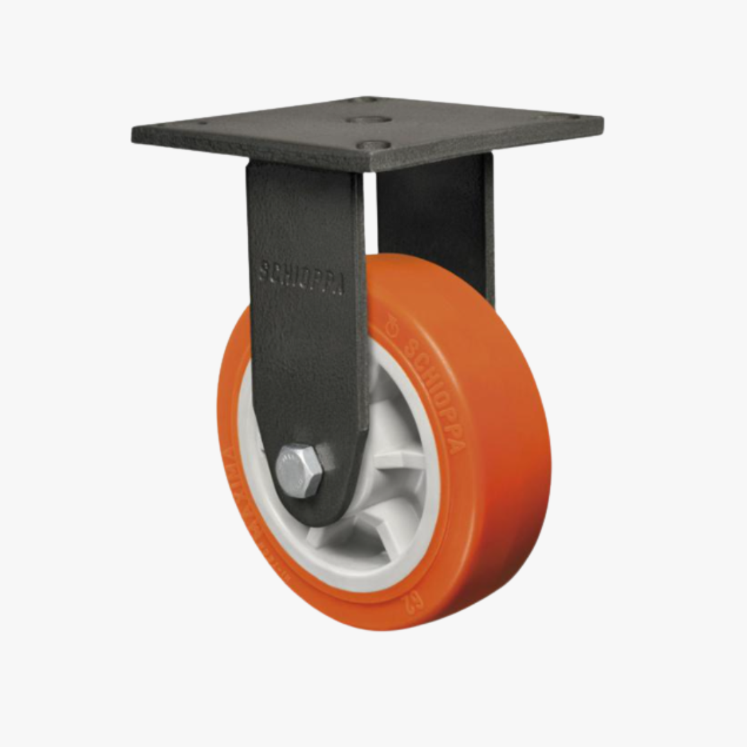 Roda UP: Poliuretano Termoplástico. Dureza: 90 Shore A. (-20ºC a +70ºC). Produzidas com revestimento em poliuretano termoplástico elastollan e núcleo em polipropileno copolímero recicláveis. Ideais para quem procura excelente capacidade de carga alinhada a uma ótima proteção do piso com baixo ruído no deslocamento, proporcionam excelente resistência a abrasão e impactos. Resistentes a graxas, óleos minerais e alguns ácidos. A velocidade de trabalho indicada é até 4km/h.