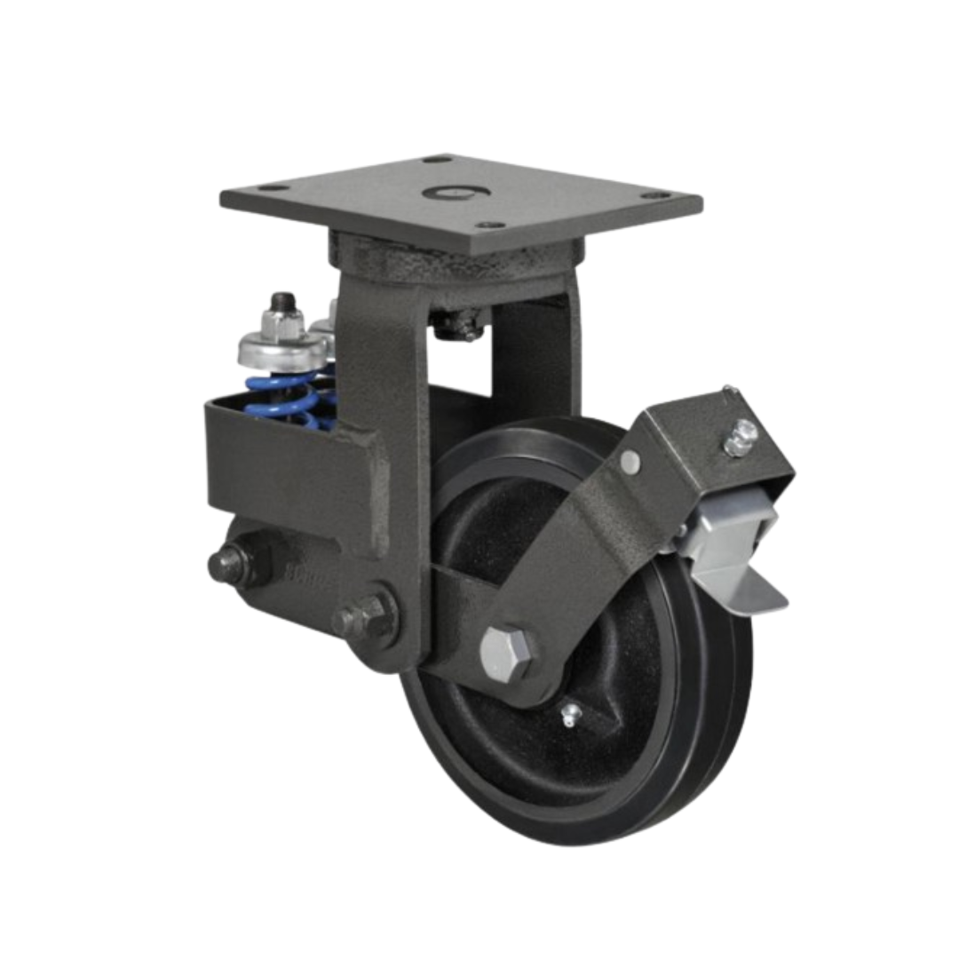 Garfo: Fabricado em aço com acabamento pintado e cabeçote com dois rolamentos axiais de esferas. Eixo da roda parafusado.