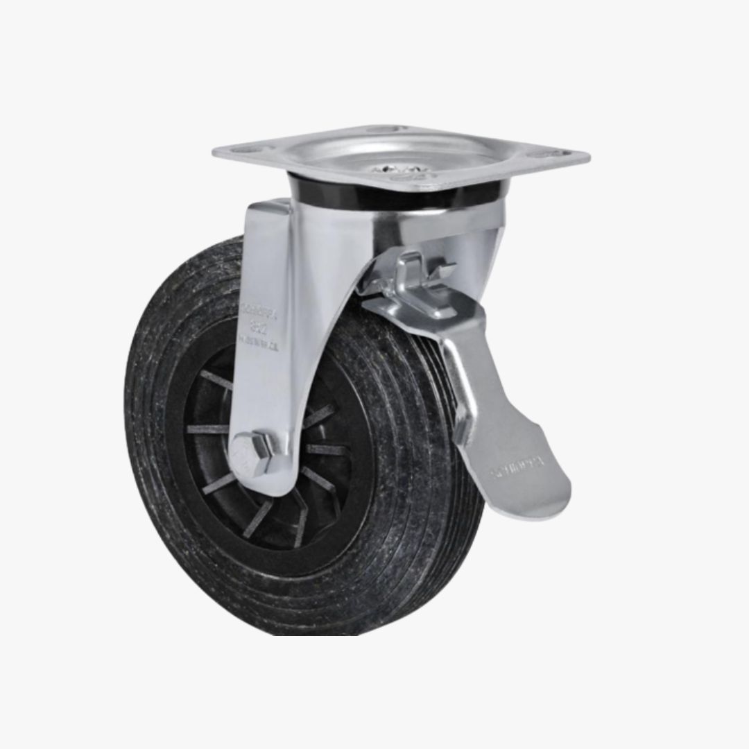 GARFO - Garfo reforçado, fabricado em chapa estampada e cabeçote com dupla pista de esferas, acabamento zincado. Eixo da roda parafusado.