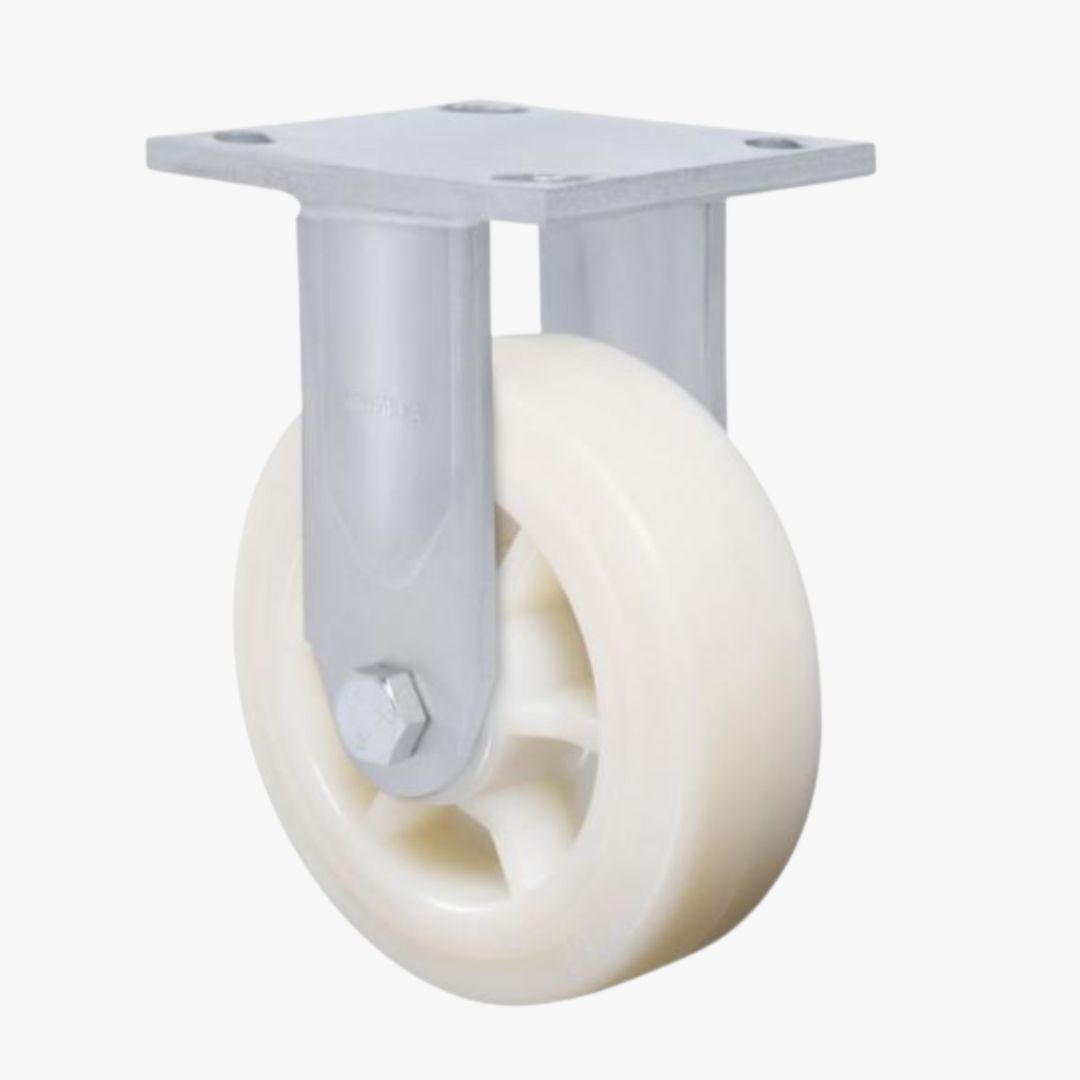 RODA NT - Nylon Técnico. Dureza: 75 Shore D. (-40ºC a +110ºC). Produzidas com revestimento e núcleo em nylon poliamida 6.0 de alta qualidade. São leves e possuem ótima resistência mecânica, rodam com muita facilidade exigindo menor esforço para manobras e movimentação. Ideais para aplicações em ambientes úmidos, são resistente as graxas, óleos, sais e alguns tipos de ácidos. Fabricadas com material reciclável. A velocidade de trabalho indicada é até 4km/h.