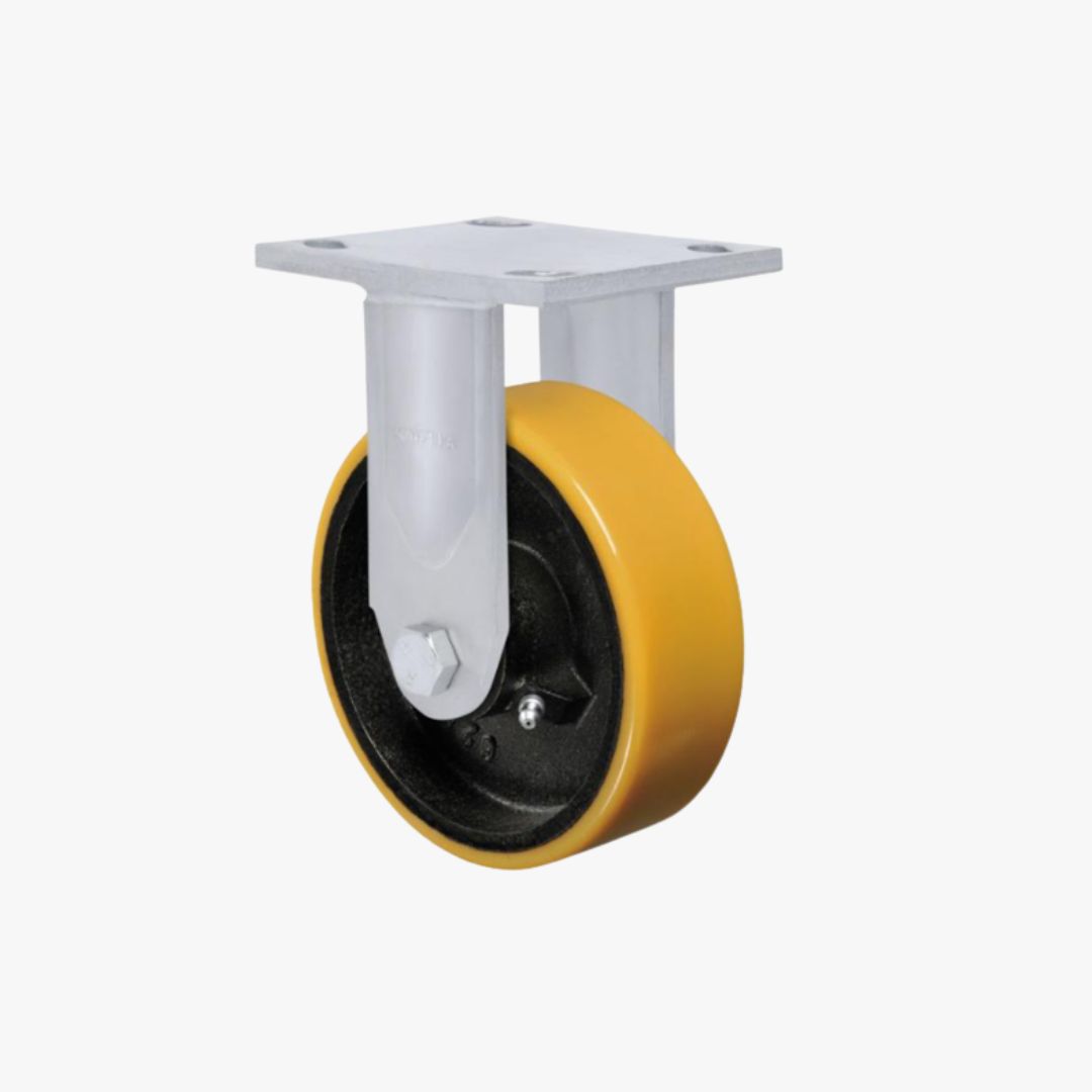 RODA P - Poliuretano Moldado. Dureza: 90 Shore A. (-40ºC a +80ºC). Produzidas com revestimento em poliuretano moldado e núcleo em ferro fundido cinzento. Ideais para aplicações nos mais diversos tipos de superfícies e ambientes. Suportam altas cargas, protegem o piso, necessitam de menor esforço para movimentação, produzem baixo nível de ruídos no deslocamento e têm excelente durabilidade. Possuem excelente resistência a abrasão, impactos, intempéries e produtos químicos como graxas, óleos, sais e solventes. Podem ser utilizadas a uma velocidade de até 20km/h quando montadas com rolamento de esferas.
