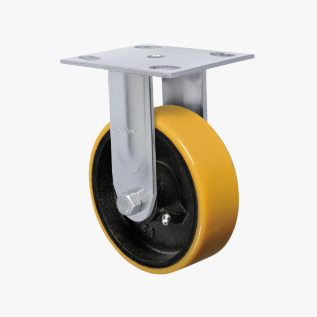 Roda P: Poliuretano Moldado. Dureza: 90 Shore A. (-40ºC a +80ºC). Produzidas com revestimento em poliuretano moldado e núcleo em ferro fundido cinzento. Ideais para aplicações nos mais diversos tipos de superfícies e ambientes. Suportam altas cargas, protegem o piso, necessitam de menor esforço para movimentação, produzem baixo nível de ruídos no deslocamento e têm excelente durabilidade. Possuem excelente resistência a abrasão, impactos, intempéries e produtos químicos como graxas, óleos, sais e solventes. Podem ser utilizadas a uma velocidade de até 4km/h.