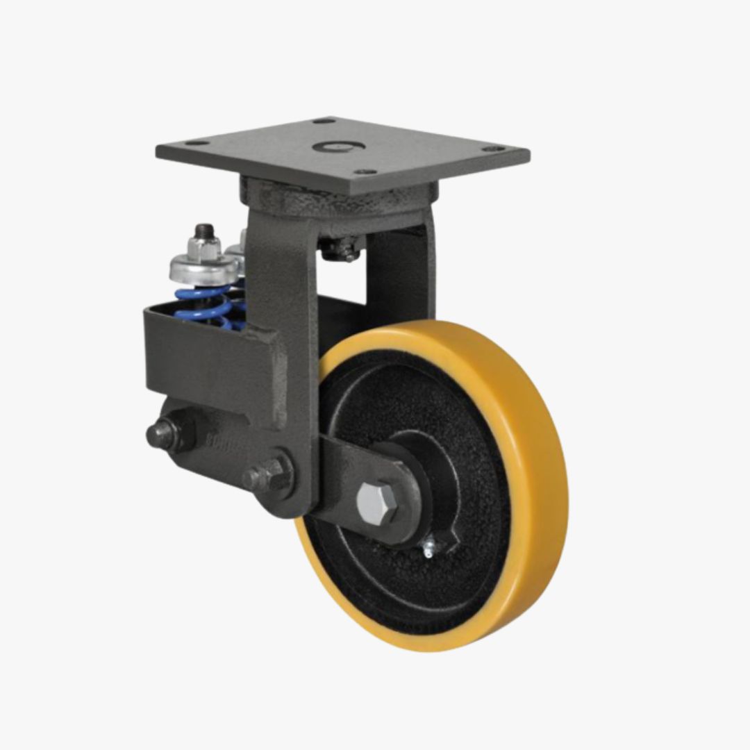 RODA P - Poliuretano Moldado. Dureza: 90 Shore A. (-40ºC a +80ºC). Produzidas com revestimento em poliuretano moldado e núcleo em ferro fundido cinzento. Ideais para aplicações nos mais diversos tipos de superfícies e ambientes. Suportam altas cargas, protegem o piso, necessitam de menor esforço para movimentação, produzem baixo nível de ruídos no deslocamento e têm excelente durabilidade. Possuem excelente resistência a abrasão, impactos, intempéries e produtos químicos como graxas, óleos, sais e solventes. Podem ser utilizadas a uma velocidade de até 20km/h quando montadas com rolamento de esferas.