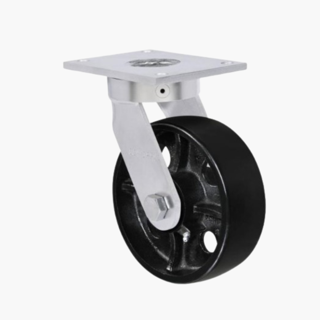 Roda F: Ferro Fundido. Dureza: 160 Brinell. (-40 a +400ºC). Produzidas com ferro fundido cinzento, rodam com muita facilidade e proporcionam grande redução do esforço de movimentação. São muito resistentes e suportam cargas e temperaturas elevadas. Não são indicadas para a utilização quando o nível de ruídos e a conservação do piso são necessários.