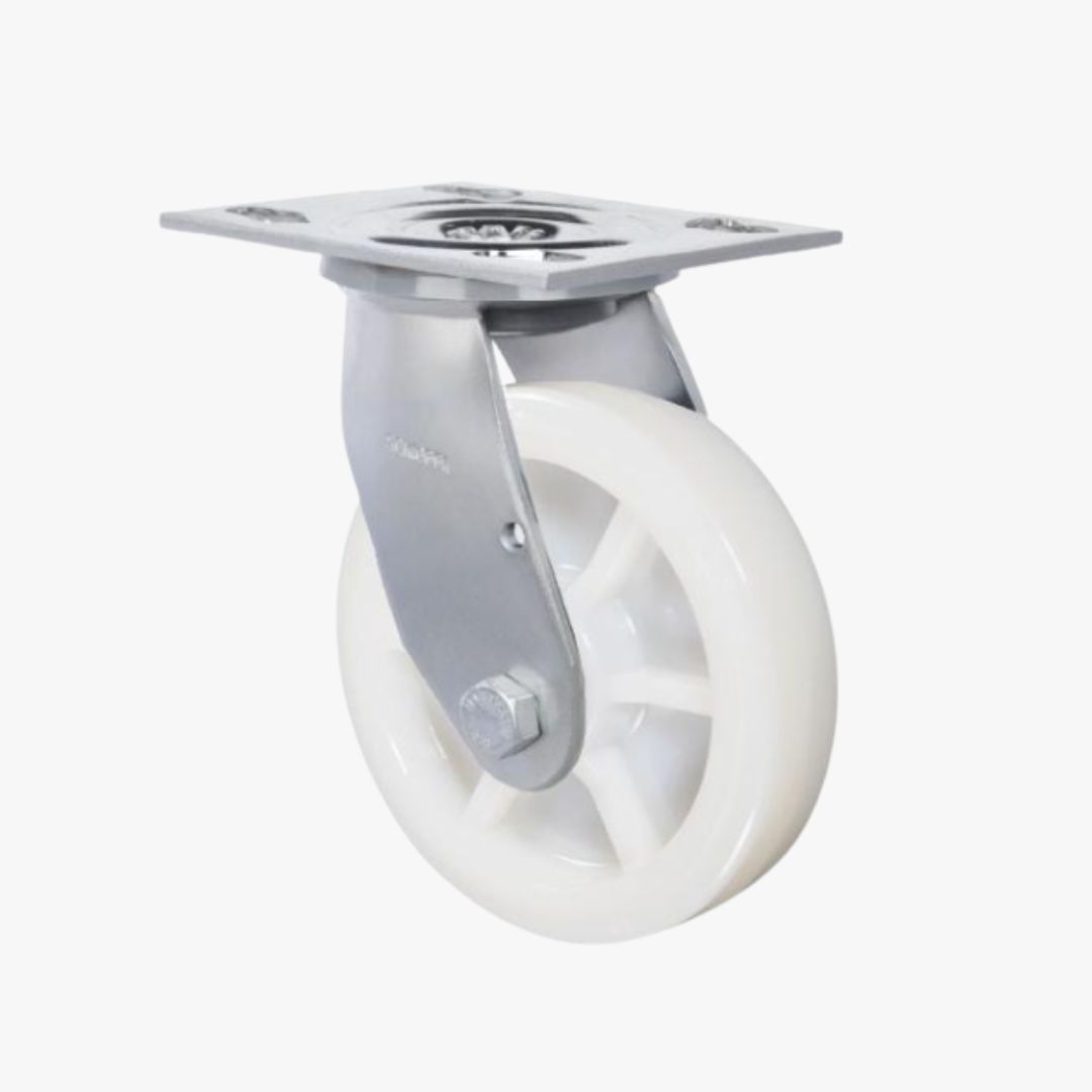RODA NT - Nylon Técnico. Dureza: 75 Shore D. (-40ºC a +110ºC). Produzidas com revestimento e núcleo em nylon poliamida 6.0 de alta qualidade. São leves e possuem ótima resistência mecânica, rodam com muita facilidade exigindo menor esforço para manobras e movimentação. Ideais para aplicações em ambientes úmidos, são resistente as graxas, óleos, sais e alguns tipos de ácidos. Fabricadas com material reciclável. A velocidade de trabalho indicada é até 4 km/h.
