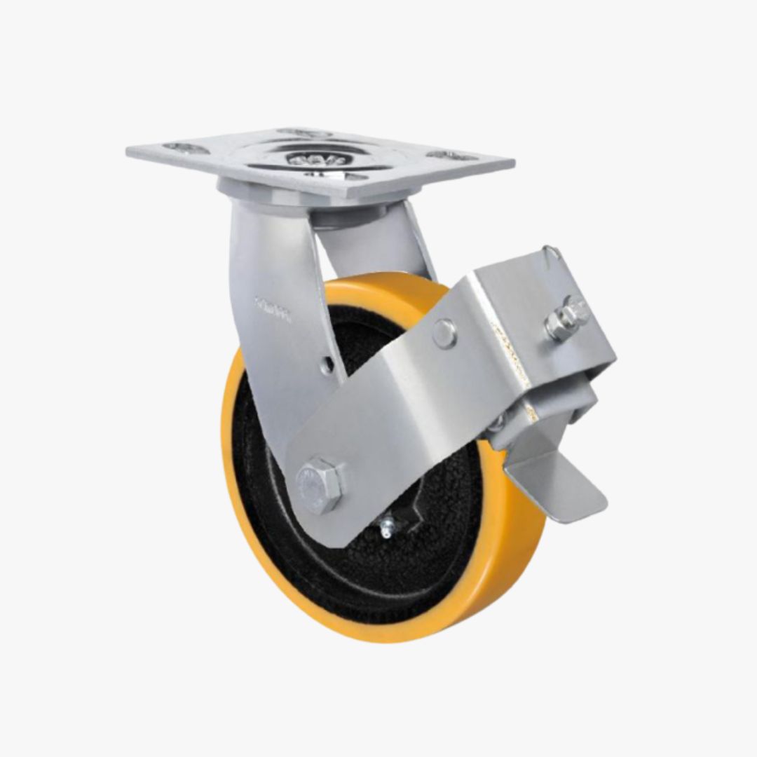 RODA P - Poliuretano Moldado. Dureza: 90 Shore A. (-40ºC a +80ºC). Produzidas com revestimento em poliuretano moldado e núcleo em ferro fundido cinzento. Ideais para aplicações nos mais diversos tipos de superfícies e ambientes. Suportam altas cargas, protegem o piso, necessitam de menor esforço para movimentação, produzem baixo nível de ruídos no deslocamento e têm excelente durabilidade. Possuem excelente resistência a abrasão, impactos, intempéries e produtos químicos como graxas, óleos, sais e solventes. Podem ser utilizadas a uma velocidade de até 4km/h.