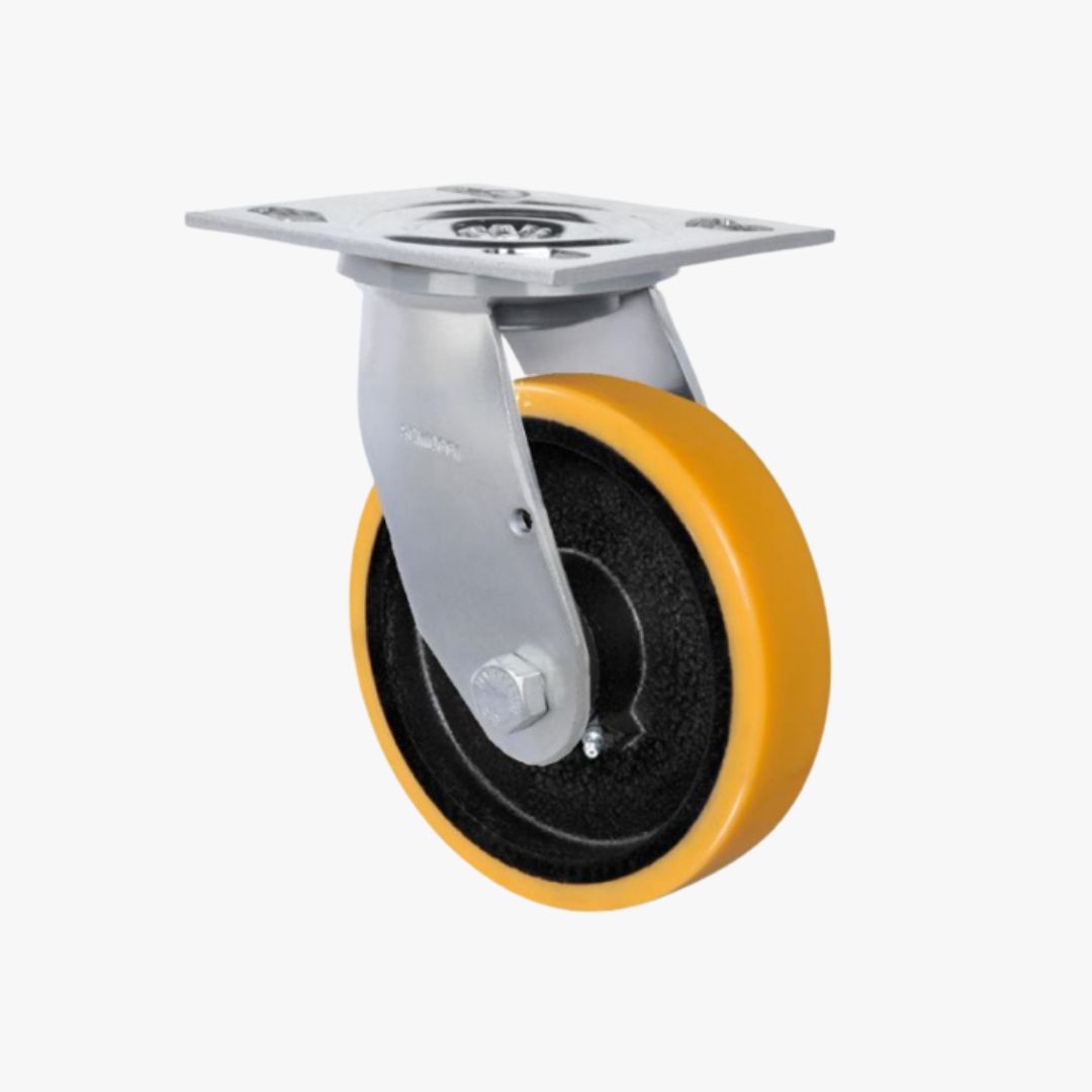 RODA P - Poliuretano Moldado. Dureza: 90 Shore A. (-40ºC a +80ºC). Produzidas com revestimento em poliuretano moldado e núcleo em ferro fundido cinzento. Ideais para aplicações nos mais diversos tipos de superfícies e ambientes. Suportam altas cargas, protegem o piso, necessitam de menor esforço para movimentação, produzem baixo nível de ruídos no deslocamento e têm excelente durabilidade. Possuem excelente resistência a abrasão, impactos, intempéries e produtos químicos como graxas, óleos, sais e solventes. Podem ser utilizadas a uma velocidade de até 4km/h.