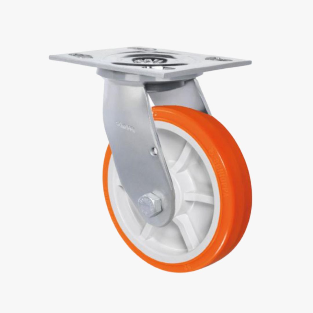 RODA UP - Poliuretano Termoplástico. Dureza: 90 Shore A. (-20ºC a +70ºC). Produzidas com revestimento em poliuretano termoplástico elastollan e núcleo em polipropileno copolímero recicláveis. Ideais para quem procura excelente capacidade de carga alinhada a uma ótima proteção do piso com baixo ruído no deslocamento, proporcionam excelente resistência a abrasão e impactos. Resistentes a graxas, óleos minerais e alguns ácidos. A velocidade de trabalho indicada é até 4km/h.