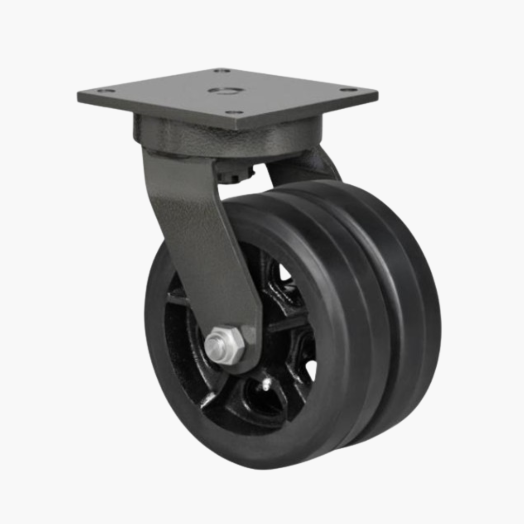 Roda B: Borracha Moldada. Dureza: 80 Shore A. (-20ºC e +70ºC). Produzidas com revestimento de borracha moldada vulcanizada em núcleo de ferro fundido cinzento. Rodam com suavidade e baixo nível de ruídos, absorvem choques e vibrações. São resistentes a abrasão e produtos químicos. Podem ser utilizadas em velocidades de até 20km/h quando montadas com rolamento de esferas.