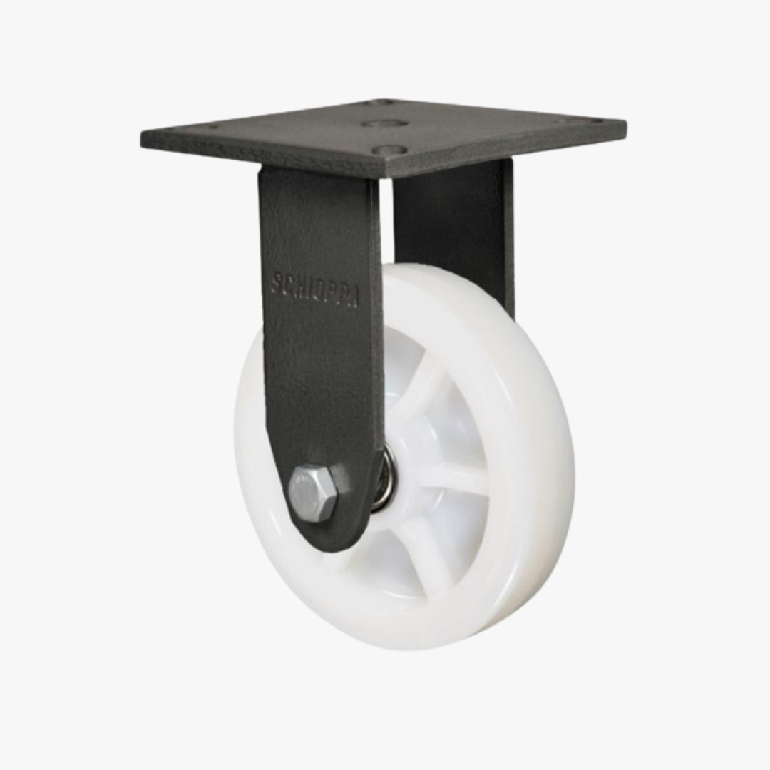Roda NT: Nylon Técnico. Dureza: 75 Shore D. (-40ºC a +110ºC). Produzidas com revestimento e núcleo em nylon poliamida 6.0 de alta qualidade. São leves e possuem ótima resistência mecânica, rodam com muita facilidade exigindo menor esforço para manobras e movimentação. Ideais para aplicações em ambientes úmidos, são resistente as graxas, óleos, sais e alguns tipos de ácidos. Fabricadas com material reciclável. A velocidade de trabalho indicada é até 4km/h.