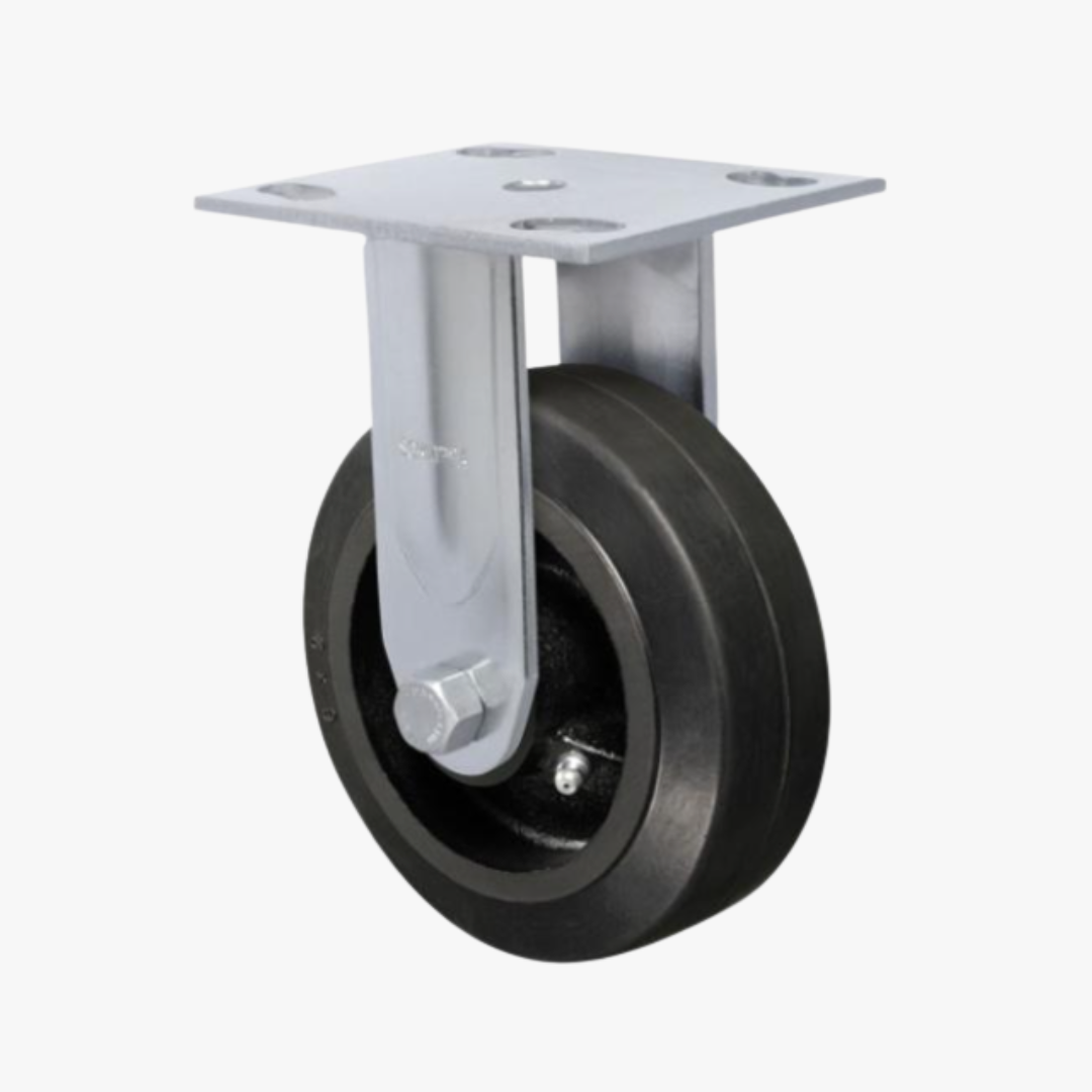 Roda B: Borracha Moldada. Dureza: 80 Shore A. (-20ºC e +70ºC). Produzidas com revestimento de borracha moldada vulcanizada em núcleo de ferro fundido cinzento. Rodam com suavidade e baixo nível de ruídos, absorvem choques e vibrações. São resistentes a abrasão e produtos químicos. Podem ser utilizadas em velocidades de até 10km/h quando montadas com rolamento de esferas.