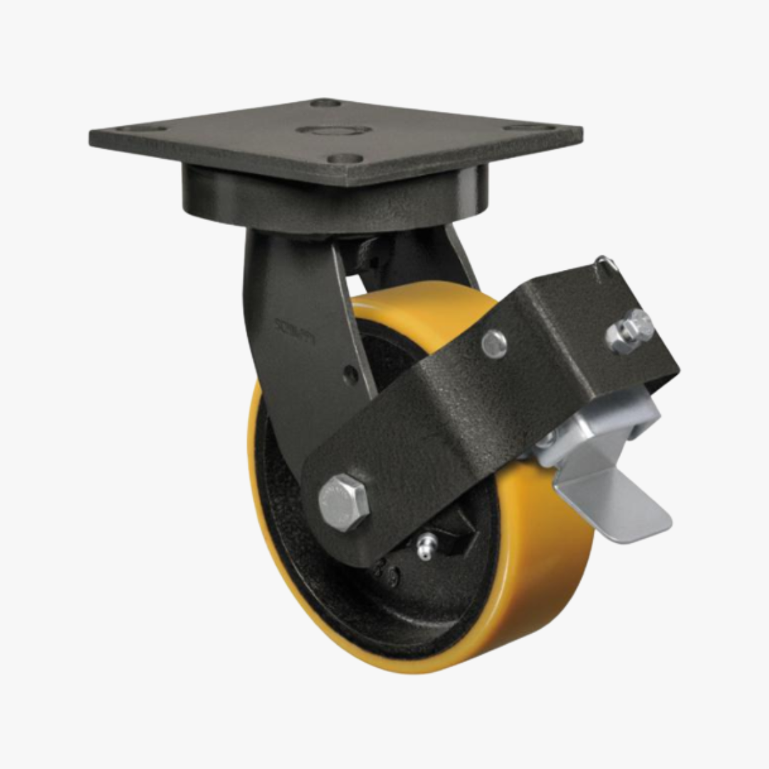 Roda P: Poliuretano Moldado. Dureza: 90 Shore A. (-40ºC a +80ºC). Produzidas com revestimento em poliuretano moldado e núcleo em ferro fundido cinzento. Ideais para aplicações nos mais diversos tipos de superfícies e ambientes. Suportam altas cargas, protegem o piso, necessitam de menor esforço para movimentação, produzem baixo nível de ruídos no deslocamento e têm excelente durabilidade. Possuem excelente resistência a abrasão, impactos, intempéries e produtos químicos como graxas, óleos, sais e solventes. Podem ser utilizadas a uma velocidade de até 20km/h quando montadas com rolamento de esferas.