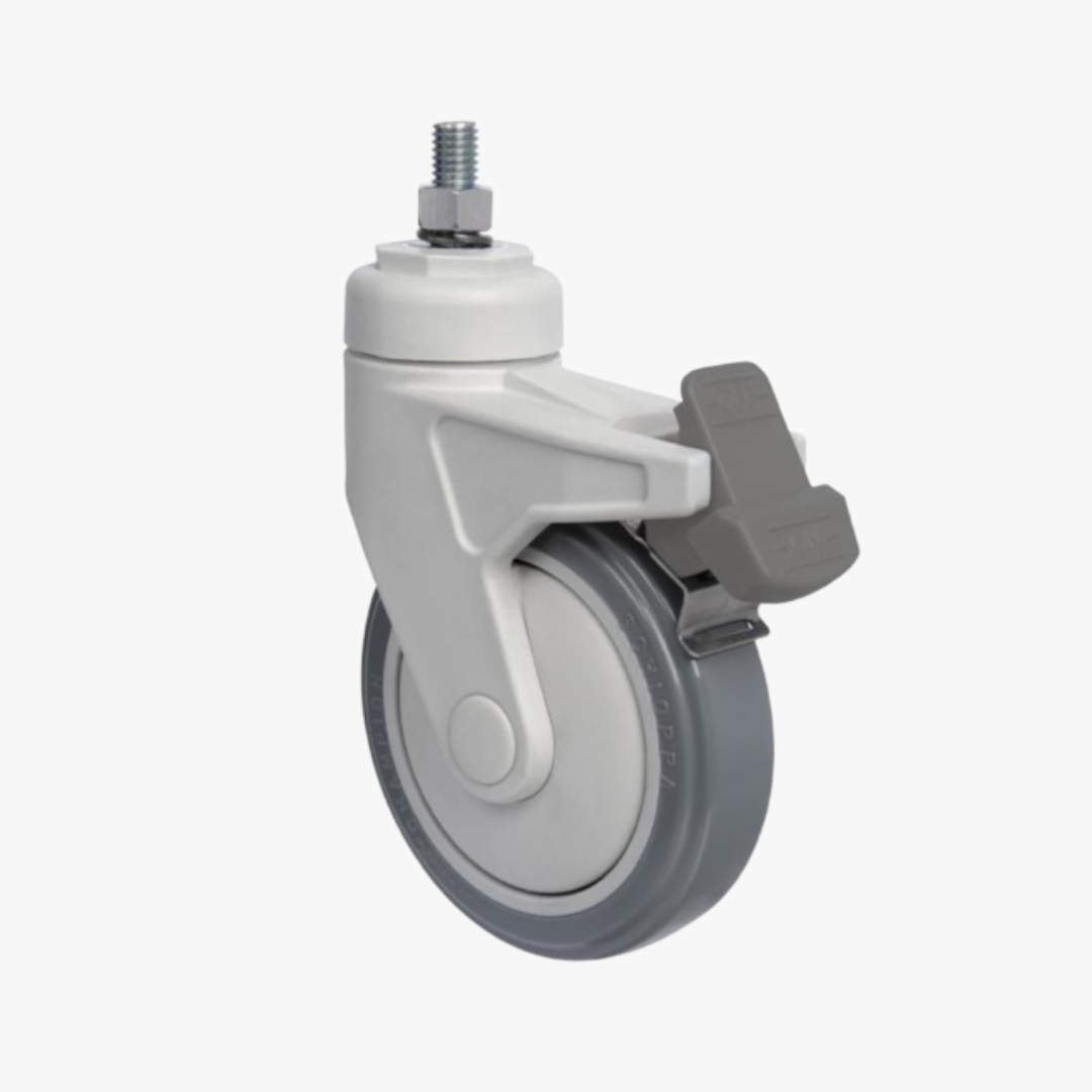 Roda de borracha BP: Composto Termoplástico com PVC. Dureza: 80 Shore A. (-10ºC a +50ºC). Produzidas com revestimento em composto termoplástico com PVC e núcleo em polipropileno copolímero recicláveis. Proporcionam rodagem macia e silenciosa, ótima proteção ao piso, excelente resistência química, boa resistência ao desgaste e aos impactos, resultando em ótima relação custo benefício. A velocidade de trabalho indicada é até 4km/h.