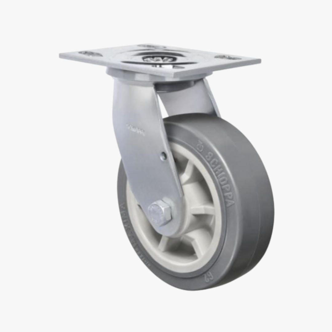 Roda BP: Composto Termoplástico com PVC. Dureza: 80 Shore A. (-10ºC a +50ºC). Produzidas com revestimento em composto termoplástico com PVC e núcleo em polipropileno copolímero recicláveis. Proporcionam rodagem macia e silenciosa, ótima proteção ao piso, excelente resistência química, boa resistência ao desgaste e aos impactos, resultando em ótima relação custo benefício. A velocidade de trabalho indicada é até 4km/h.