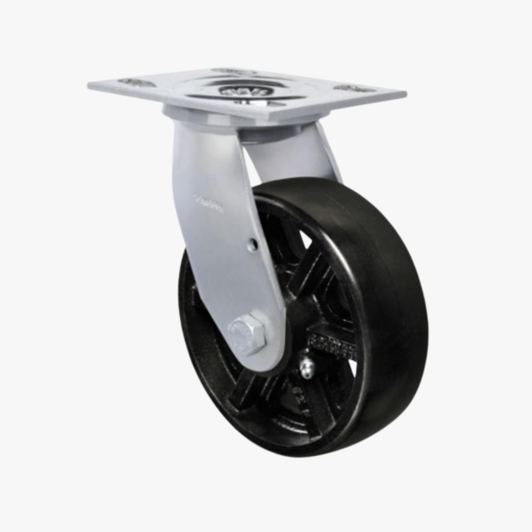 Roda F: Ferro Fundido. Dureza: 160 Brinell. (-40 a +400ºC). Produzidas com ferro fundido cinzento, rodam com muita facilidade e proporcionam grande redução do esforço de movimentação. São muito resistentes e suportam cargas e temperaturas elevadas. Não são indicadas para a utilização quando o nível de ruídos e a conservação do piso são necessários.