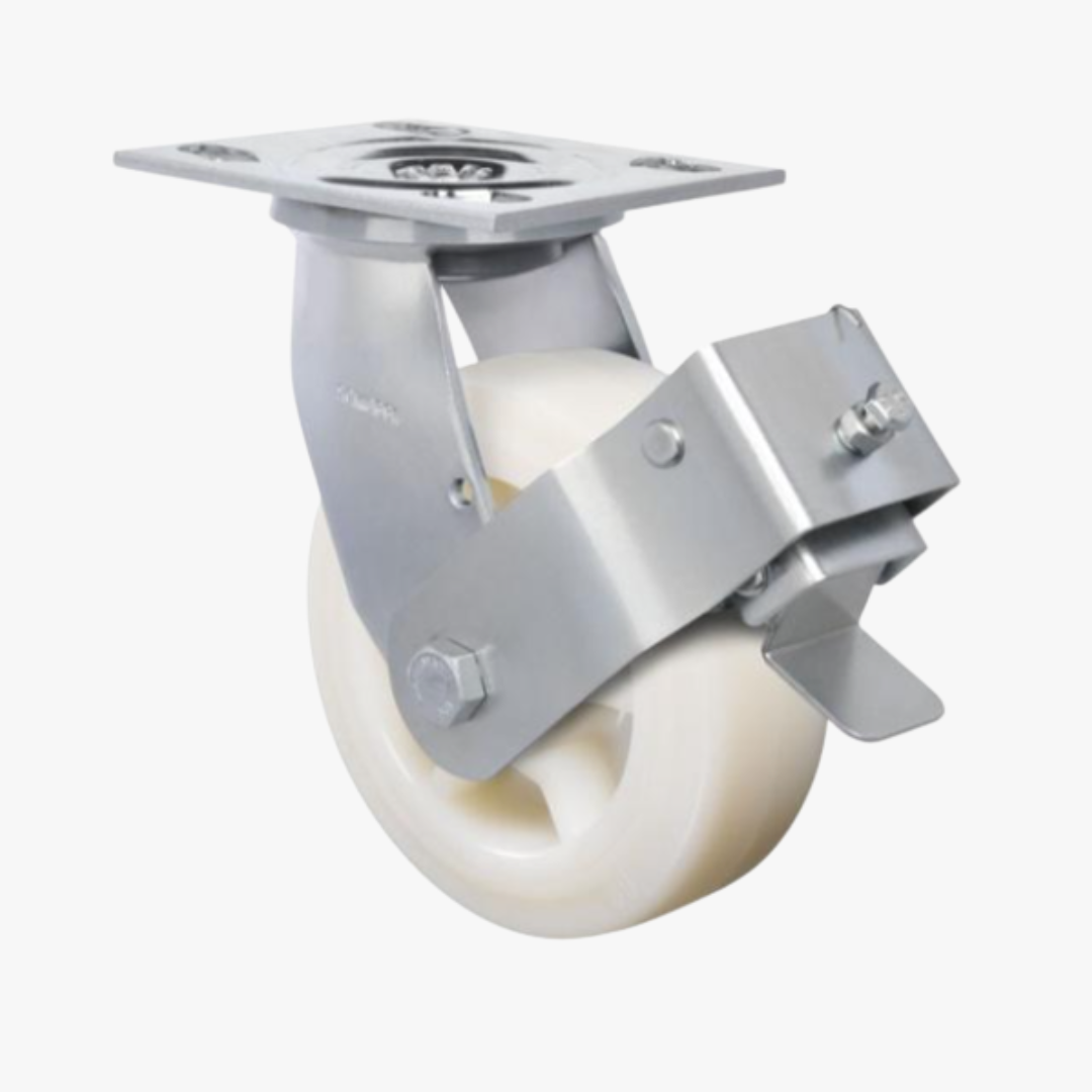 Roda NT: Nylon Técnico. Dureza: 75 Shore D. (-40ºC a +110ºC). Produzidas com revestimento e núcleo em nylon poliamida 6.0 de alta qualidade. São leves e possuem ótima resistência mecânica, rodam com muita facilidade exigindo menor esforço para manobras e movimentação. Ideais para aplicações em ambientes úmidos, são resistente as graxas, óleos, sais e alguns tipos de ácidos. Fabricadas com material reciclável. A velocidade de trabalho indicada é até 4 km/h.