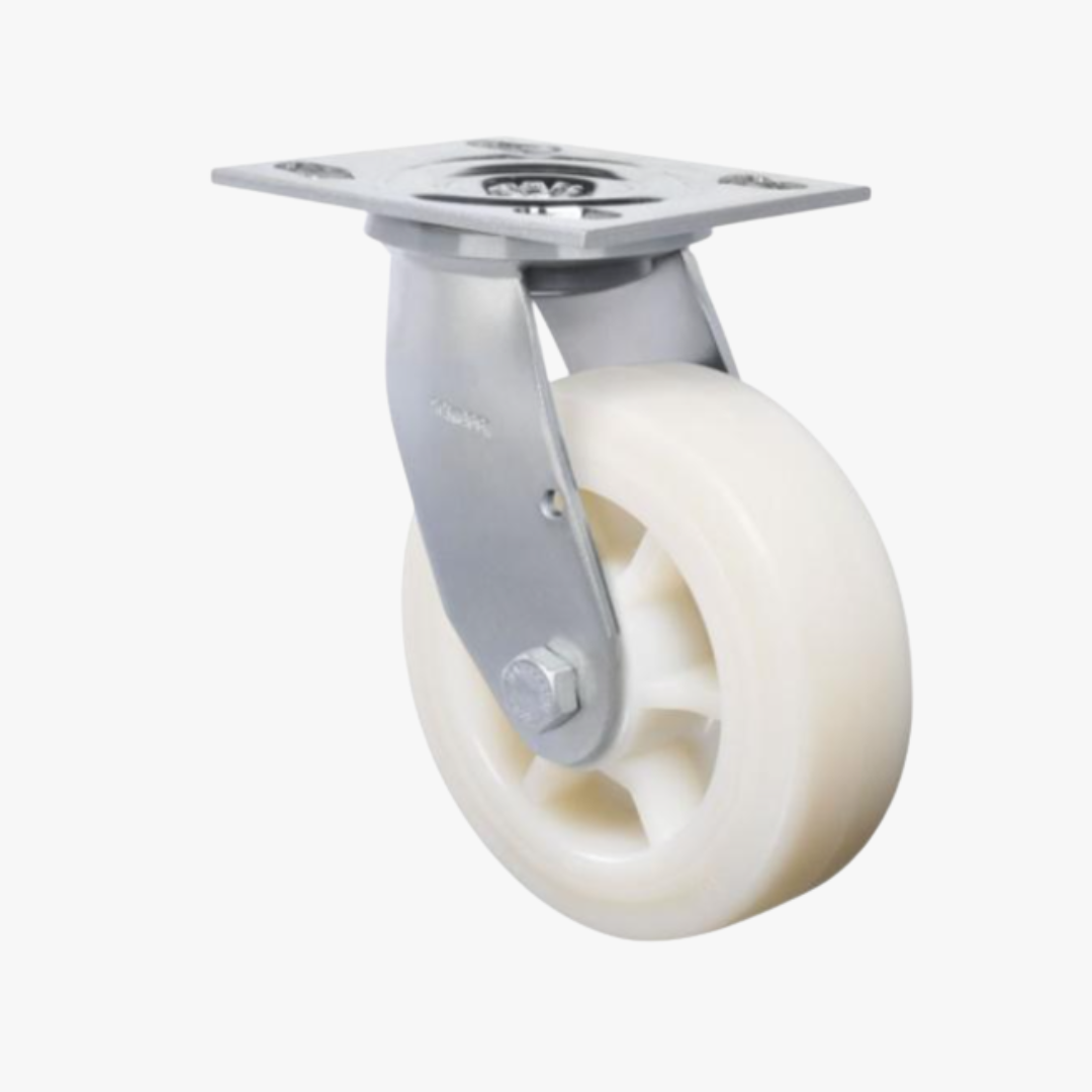 Roda NT: Nylon Técnico. Dureza: 75 Shore D. (-40ºC a +110ºC). Produzidas com revestimento e núcleo em nylon poliamida 6.0 de alta qualidade. São leves e possuem ótima resistência mecânica, rodam com muita facilidade exigindo menor esforço para manobras e movimentação. Ideais para aplicações em ambientes úmidos, são resistente as graxas, óleos, sais e alguns tipos de ácidos. Fabricadas com material reciclável. A velocidade de trabalho indicada é até 4 km/h.
