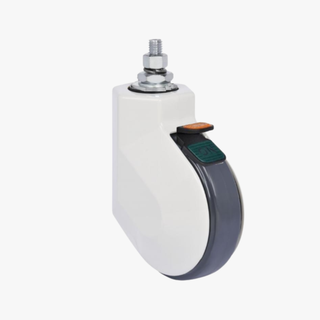 Garfo: Rodízio fabricado com estrutura interna em aço revestido por peças injetadas para diminuir a entrada de poeira e facilitar a limpeza sem tirar o rodízio de serviço. Possui um sistema de freio moderno de fácil acionamento com dois pedais. ON para acionar e OFF soltar.