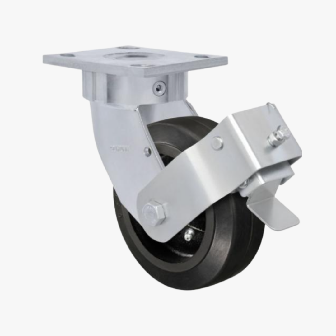 Roda B: Borracha Moldada. Dureza: 80 Shore A. (-20ºC e +70ºC). Produzidas com revestimento de borracha moldada vulcanizada em núcleo de ferro fundido cinzento. Rodam com suavidade e baixo nível de ruídos, absorvem choques e vibrações. São resistentes a abrasão e produtos químicos. Podem ser utilizadas em velocidades de até 20km/h quando montadas com rolamento de esferas.