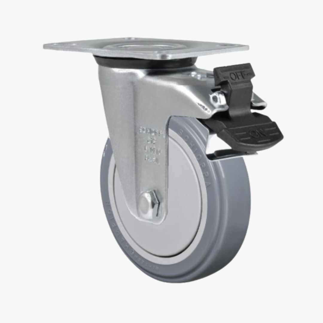 Roda de borracha BP: Composto Termoplástico com PVC. Dureza: 80 Shore A. (-10ºC a +50ºC). Produzidas com revestimento em composto termoplástico com PVC e núcleo em polipropileno copolímero recicláveis. Proporcionam rodagem macia e silenciosa, ótima proteção ao piso, excelente resistência química, boa resistência ao desgaste e aos impactos, resultando em ótima relação custo benefício. A velocidade de trabalho indicada é até 4km/h.