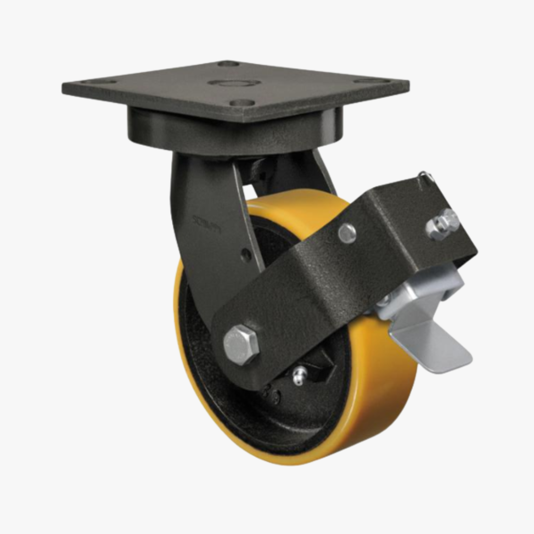 Roda P: Poliuretano Moldado. Dureza: 90 Shore A. (-40ºC a +80ºC). Produzidas com revestimento em poliuretano moldado e núcleo em ferro fundido cinzento. Ideais para aplicações nos mais diversos tipos de superfícies e ambientes. Suportam altas cargas, protegem o piso, necessitam de menor esforço para movimentação, produzem baixo nível de ruídos no deslocamento e têm excelente durabilidade. Possuem excelente resistência a abrasão, impactos, intempéries e produtos químicos como graxas, óleos, sais e solventes. Podem ser utilizadas a uma velocidade de até 20km/h quando montadas com rolamento de esferas.