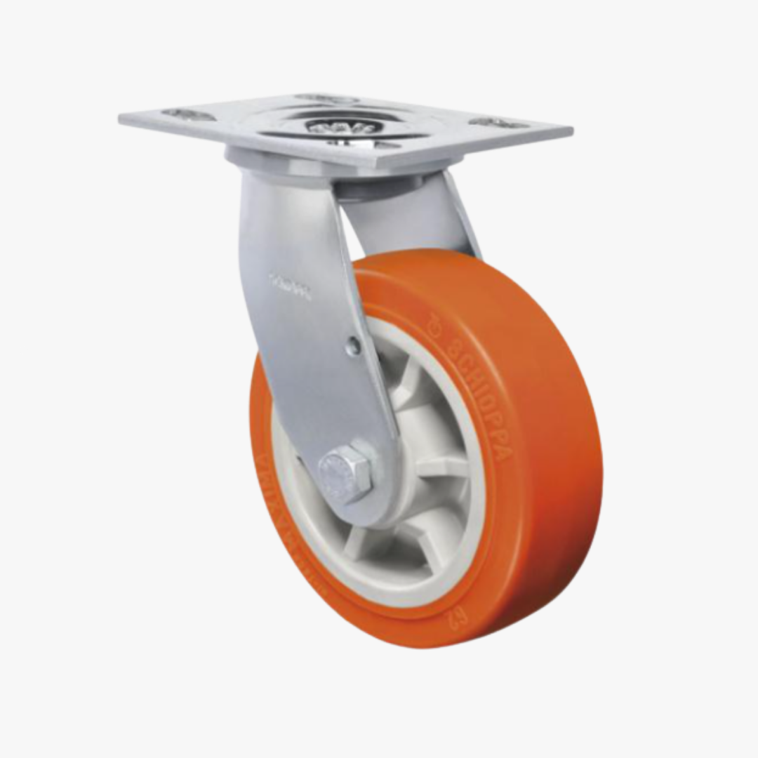 Roda UP: Poliuretano Termoplástico. Dureza: 90 Shore A. (-20ºC a +70ºC). Produzidas com revestimento em poliuretano termoplástico elastollan e núcleo em polipropileno copolímero recicláveis. Ideais para quem procura excelente capacidade de carga alinhada a uma ótima proteção do piso com baixo ruído no deslocamento, proporcionam excelente resistência a abrasão e impactos. Resistentes a graxas, óleos minerais e alguns ácidos. A velocidade de trabalho indicada é até 4km/h.