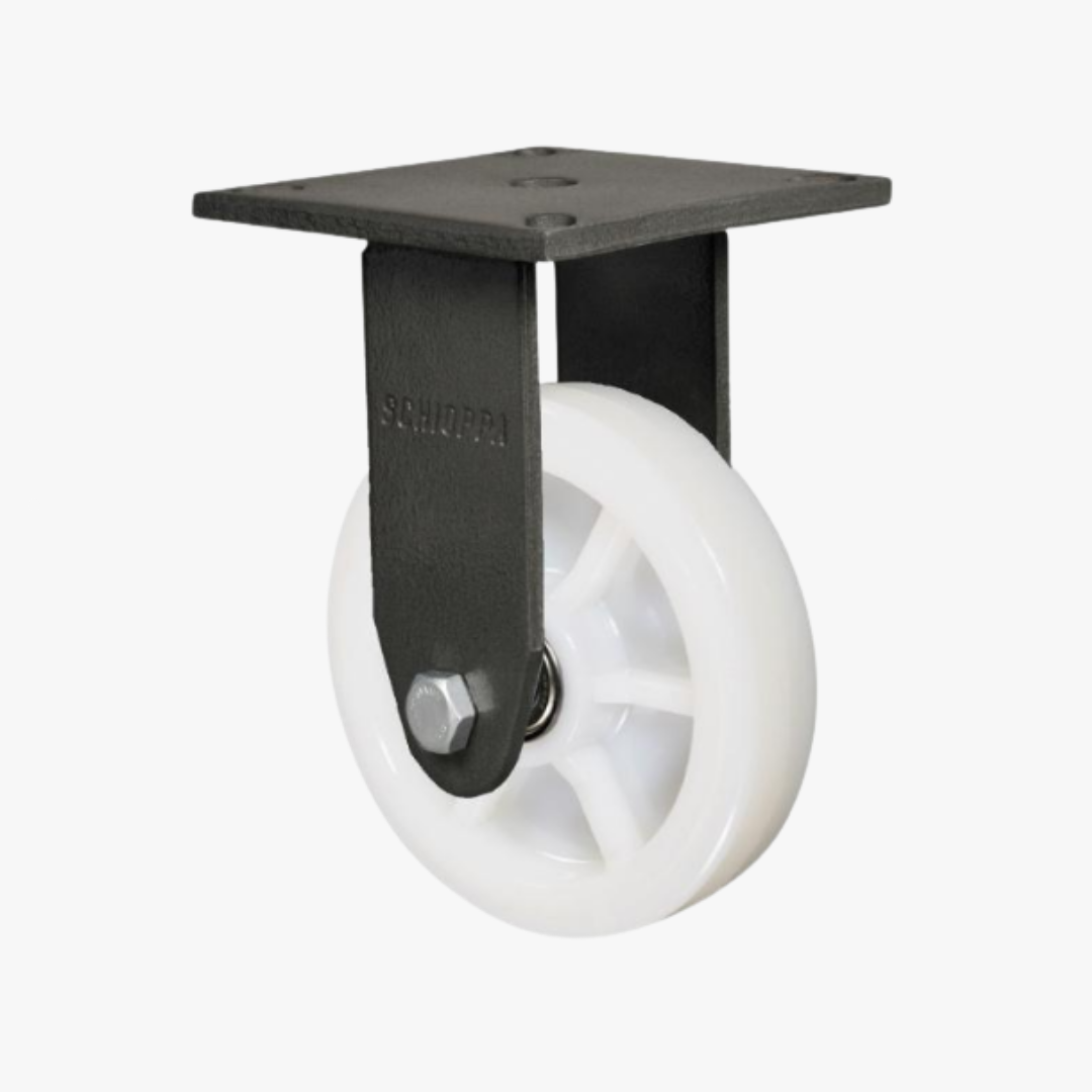 Roda NT: Nylon Técnico. Dureza: 75 Shore D. (-40ºC a +110ºC). Produzidas com revestimento e núcleo em nylon poliamida 6.0 de alta qualidade. São leves e possuem ótima resistência mecânica, rodam com muita facilidade exigindo menor esforço para manobras e movimentação. Ideais para aplicações em ambientes úmidos, são resistente as graxas, óleos, sais e alguns tipos de ácidos. Fabricadas com material reciclável. A velocidade de trabalho indicada é até 4km/h.