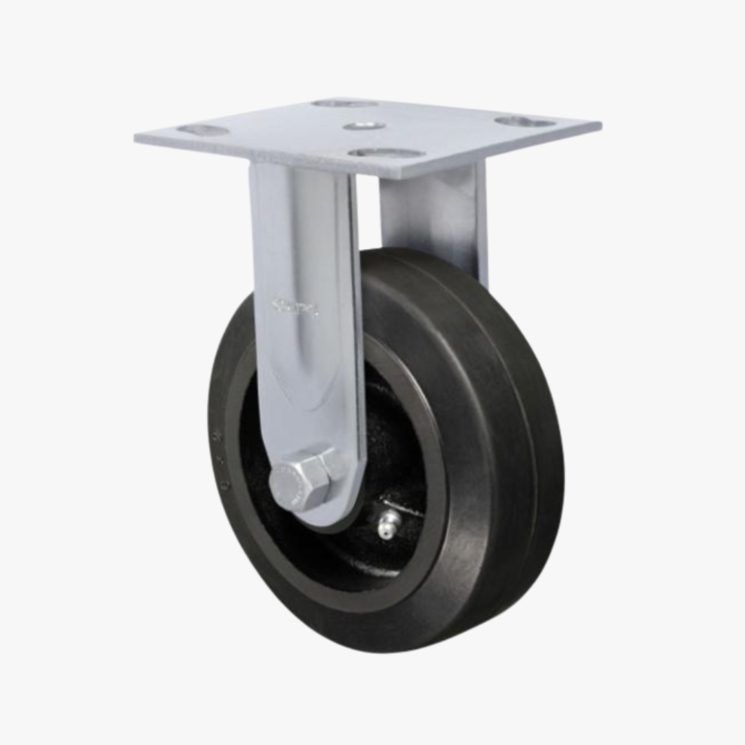 Roda B: Borracha Moldada. Dureza: 80 Shore A. (-20ºC e +70ºC). Produzidas com revestimento de borracha moldada vulcanizada em núcleo de ferro fundido cinzento. Rodam com suavidade e baixo nível de ruídos, absorvem choques e vibrações. São resistentes a abrasão e produtos químicos. Podem ser utilizadas em velocidades de até 10km/h quando montadas com rolamento de esferas.
