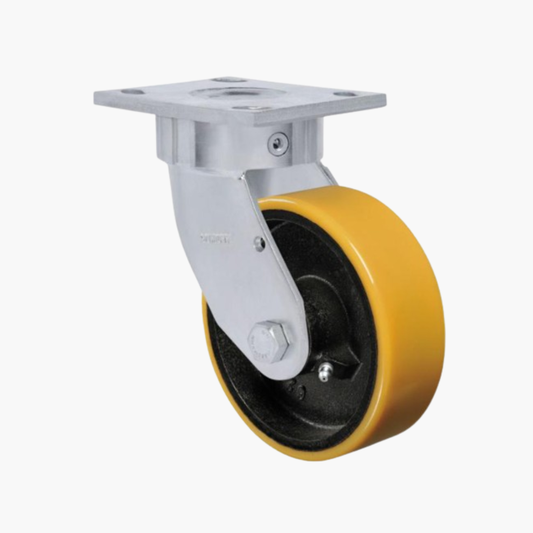 Roda P: Poliuretano Moldado. Dureza: 90 Shore A. (-40ºC a +80ºC).Produzidas com revestimento em poliuretano moldado e núcleo em ferro fundido cinzento. Ideais para aplicações nos mais diversos tipos de superfícies e ambientes. Suportam altas cargas, protegem o piso, necessitam de menor esforço para movimentação, produzem baixo nível de ruídos no deslocamento e têm excelente durabilidade. Possuem excelente resistência a abrasão, impactos, intempéries e produtos químicos como graxas, óleos, sais e solventes. Podem ser utilizadas a uma velocidade de até 20km/h quando montadas com rolamento de esferas.