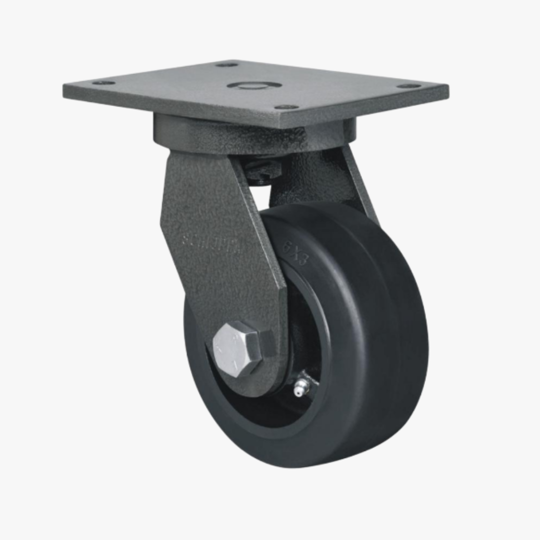RODA B: Borracha Moldada. Dureza: 80 Shore A. (-20ºC e +70ºC). Produzidas com revestimento de borracha moldada vulcanizada em núcleo de ferro fundido cinzento. Rodam com suavidade e baixo nível de ruídos, absorvem choques e vibrações. São resistentes a abrasão e produtos químicos. Podem ser utilizadas em velocidades de até 4km/h.
