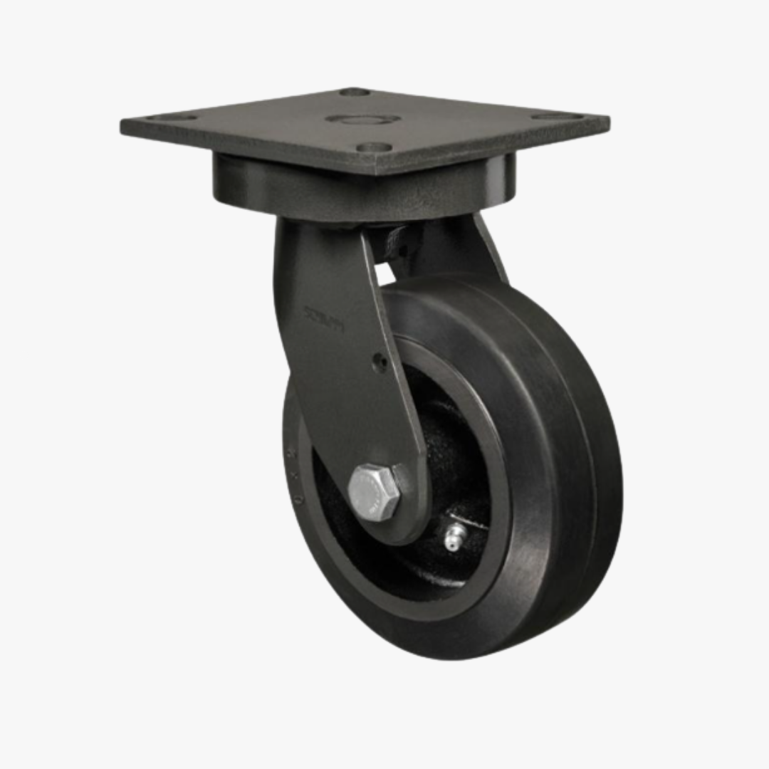 Roda B: Borracha Moldada. Dureza: 80 Shore A. (-20ºC e +70ºC). Produzidas com revestimento de borracha moldada vulcanizada em núcleo de ferro fundido cinzento. Rodam com suavidade e baixo nível de ruídos, absorvem choques e vibrações. São resistentes a abrasão e produtos químicos. Podem ser utilizadas em velocidades de até 20km/h quando montadas com rolamento de esferas.