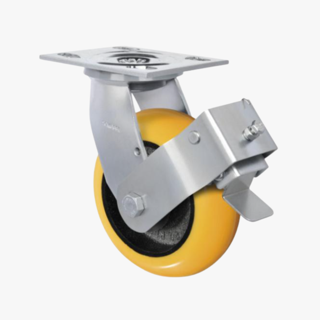 Garfo: Garfo reforçado, fabricado em chapa estampada e cabeçote com dupla pista de esferas, acabamento zincado. Eixo da roda parafusado.
