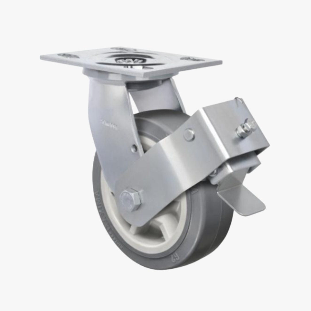 Garfo: Garfo reforçado, fabricado em chapa estampada e cabeçote com dupla pista de esferas, acabamento zincado. Eixo da roda parafusado.