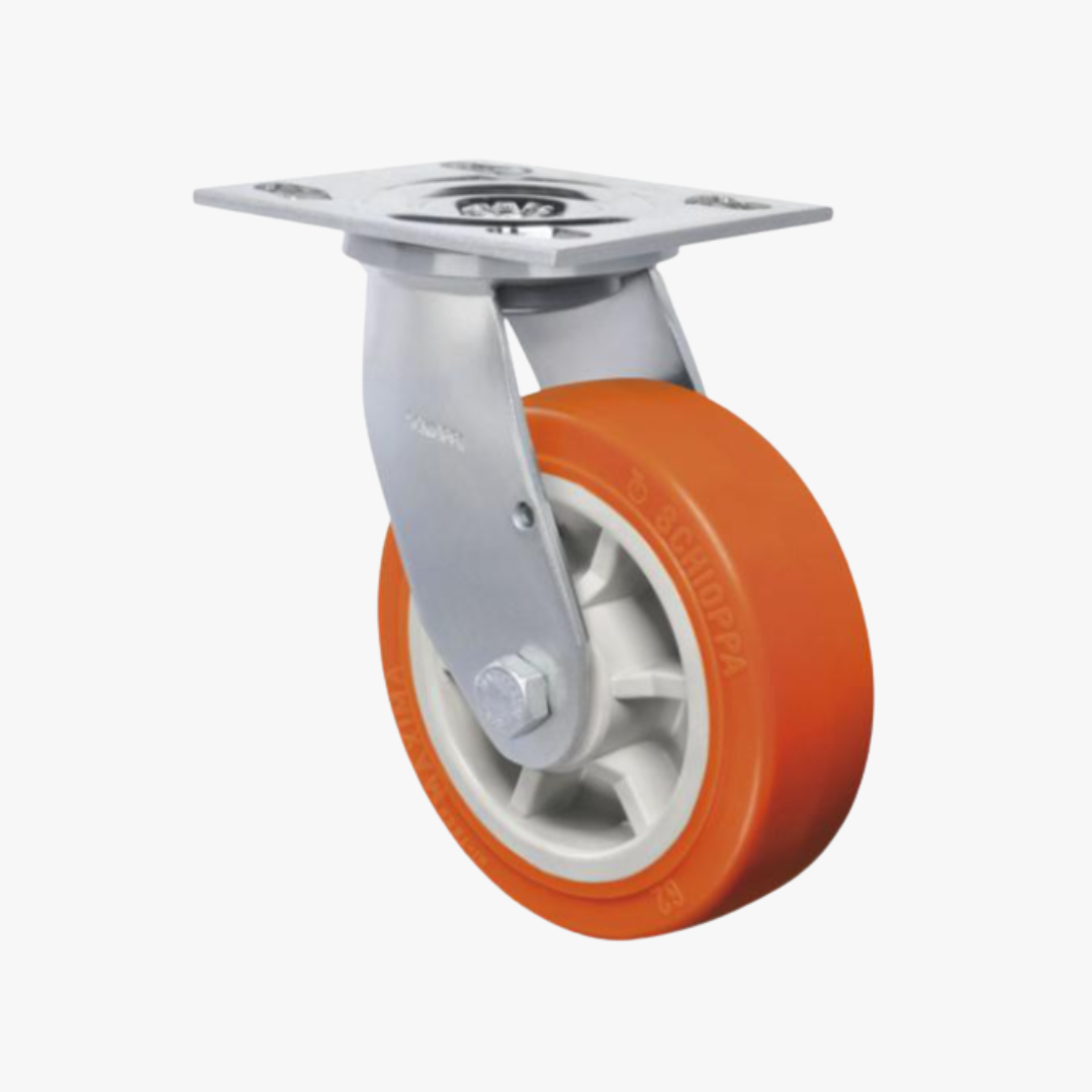 Roda UP: Poliuretano Termoplástico. Dureza: 90 Shore A. (-20ºC a +70ºC). Produzidas com revestimento em poliuretano termoplástico elastollan e núcleo em polipropileno copolímero recicláveis. Ideais para quem procura excelente capacidade de carga alinhada a uma ótima proteção do piso com baixo ruído no deslocamento, proporcionam excelente resistência a abrasão e impactos. Resistentes a graxas, óleos minerais e alguns ácidos. A velocidade de trabalho indicada é até 4km/h.