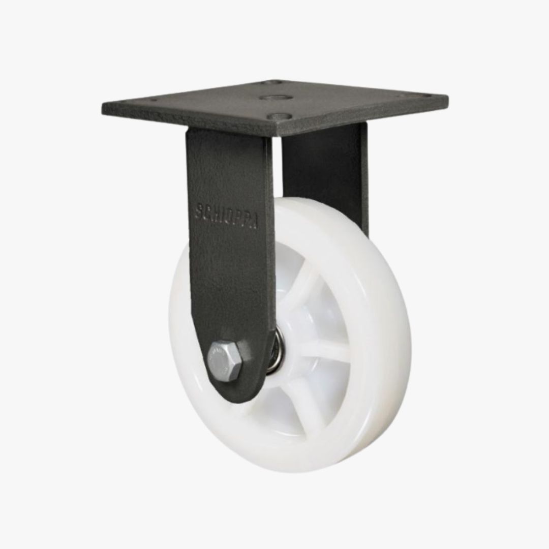 RODA NT - Nylon Técnico. Dureza: 75 Shore D. (-40ºC a +110ºC). Produzidas com revestimento e núcleo em nylon poliamida 6.0 de alta qualidade. São leves e possuem ótima resistência mecânica, rodam com muita facilidade exigindo menor esforço para manobras e movimentação. Ideais para aplicações em ambientes úmidos, são resistente as graxas, óleos, sais e alguns tipos de ácidos. Fabricadas com material reciclável. A velocidade de trabalho indicada é até 4km/h.