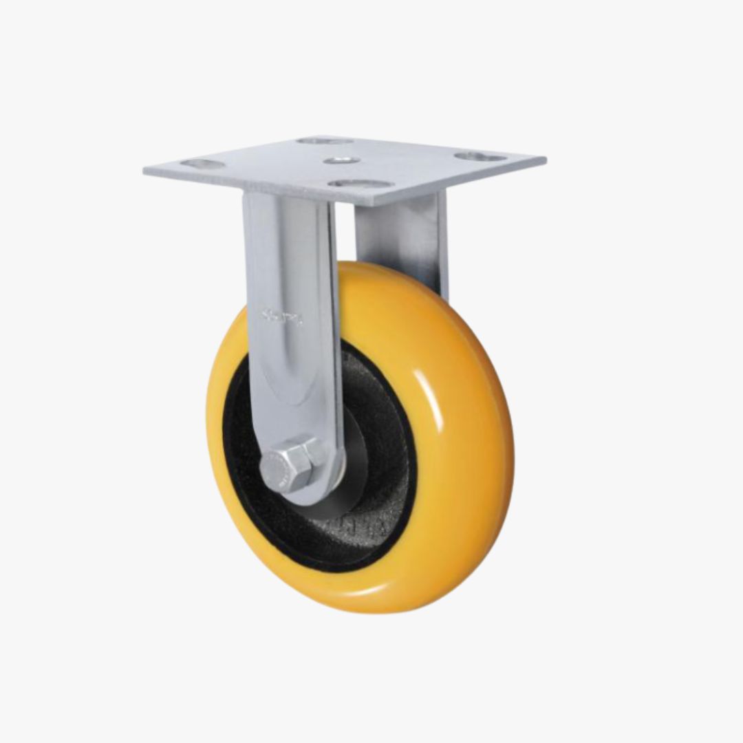 RODA BC - Poliuretano Moldado - Round. Dureza: 90 Shore A. (-40ºC a +80ºC). Produzidas com revestimento em poliuretano moldado e núcleo em ferro fundido cinzento. O perfil arredondado da face rodante proporciona redução da área de contato com o piso, facilidade para movimentação e manobras, diminuindo o esforço de manuseio e o nível de ruído no deslocamento. Proporciona durabilidade superior por ter maior camada de poliuretano do que as rodas convencionais. Possuem excelente resistência a abrasão, a impactos, a intempéries e a produtos químicos como graxas, óleos, sais e solventes. Podem ser utilizadas a uma velocidade de até 4km/h.