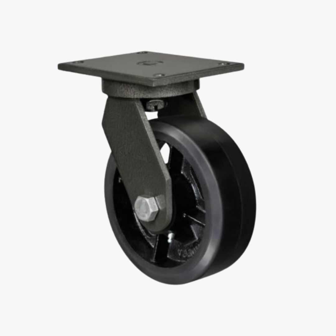 GARFO - Garfo reforçado, fabricado em aço carbono com peças estampadas e usinadas, cabeçote com dois rolamentos axiais de esferas. Acabamento pintado. Eixo da roda parafusado.