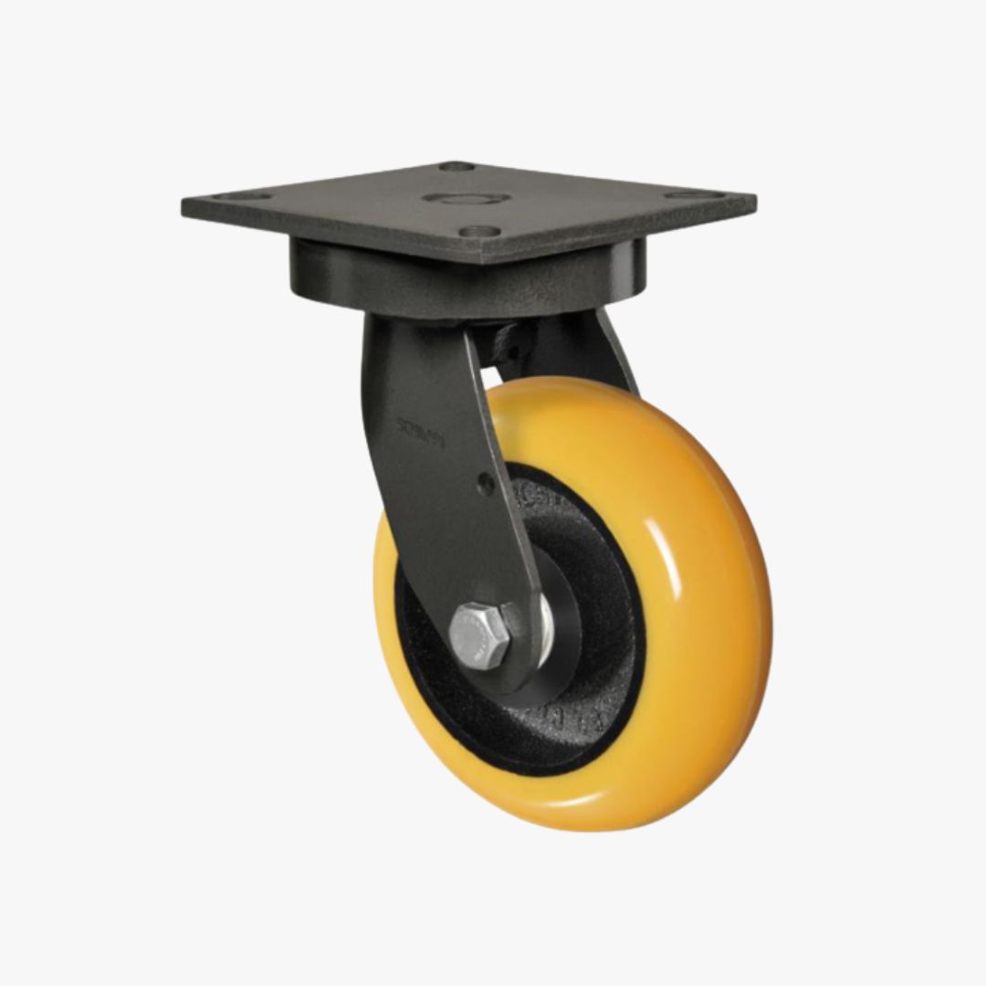 RODA BC - Poliuretano Moldado - Redondo. Dureza: 90 Shore A. (-40ºC a +80ºC). Produzidas com revestimento em poliuretano moldado e núcleo em ferro fundido cinzento. O perfil arredondado da face rodante proporciona redução da área de contato com o piso, facilidade para movimentação e manobras, experimentou o esforço de caminhada e o nível de ruído no deslocamento. Proporciona durabilidade superior por ter maior camada de poliuretano do que as rodas convencionais. Possuem excelente resistência a abrasão, a efeitos, a intempéries e a produtos químicos como graxas, óleos, sais e solventes. Podem ser utilizadas uma velocidade de até 20km/h quando montados com rolamentos de esferas.