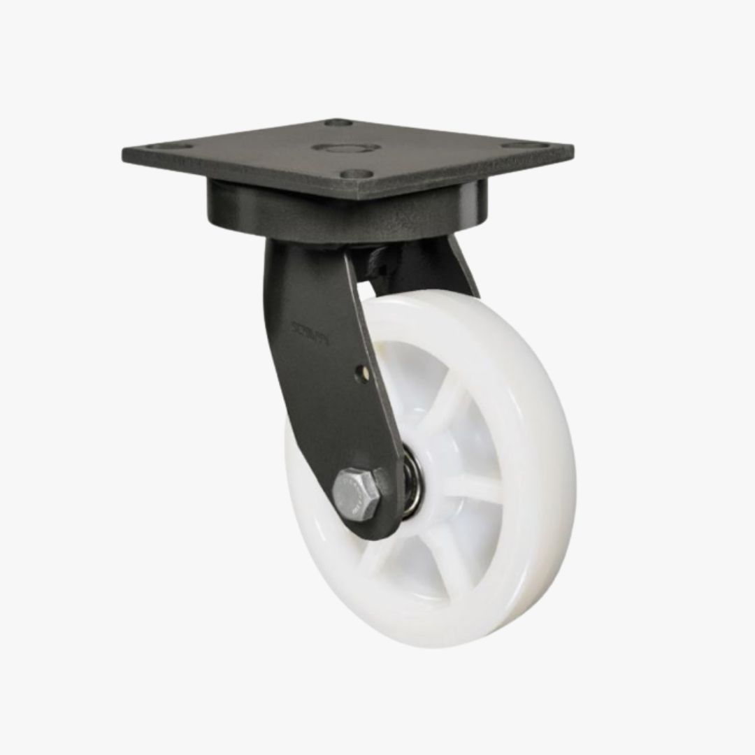 RODA NT - Nylon Técnico. Dureza: 75 Shore D. (-40ºC a +110ºC). Produzidas com revestimento e núcleo em nylon poliamida 6.0 de alta qualidade. São leves e possuem ótima resistência mecânica, rodam com muita facilidade exigindo menor esforço para manobras e movimentação. Ideais para aplicações em ambientes úmidos, são resistente as graxas, óleos, sais e alguns tipos de ácidos. Fabricadas com material reciclável. A velocidade de trabalho indicada é até 4km/h.