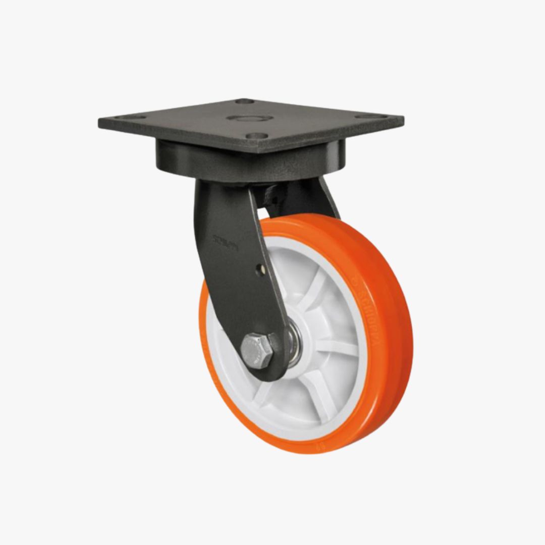 RODA UP - Poliuretano Termoplástico. Dureza: 90 Shore A. (-20ºC a +70ºC). Produzidas com revestimento em poliuretano termoplástico elastollan e núcleo em polipropileno copolímero recicláveis. Ideais para quem procura excelente capacidade de carga alinhada a uma ótima proteção do piso com baixo ruído no deslocamento, proporcionam excelente resistência a abrasão e impactos. Resistentes a graxas, óleos minerais e alguns ácidos. A velocidade de trabalho indicada é até 4km/h.