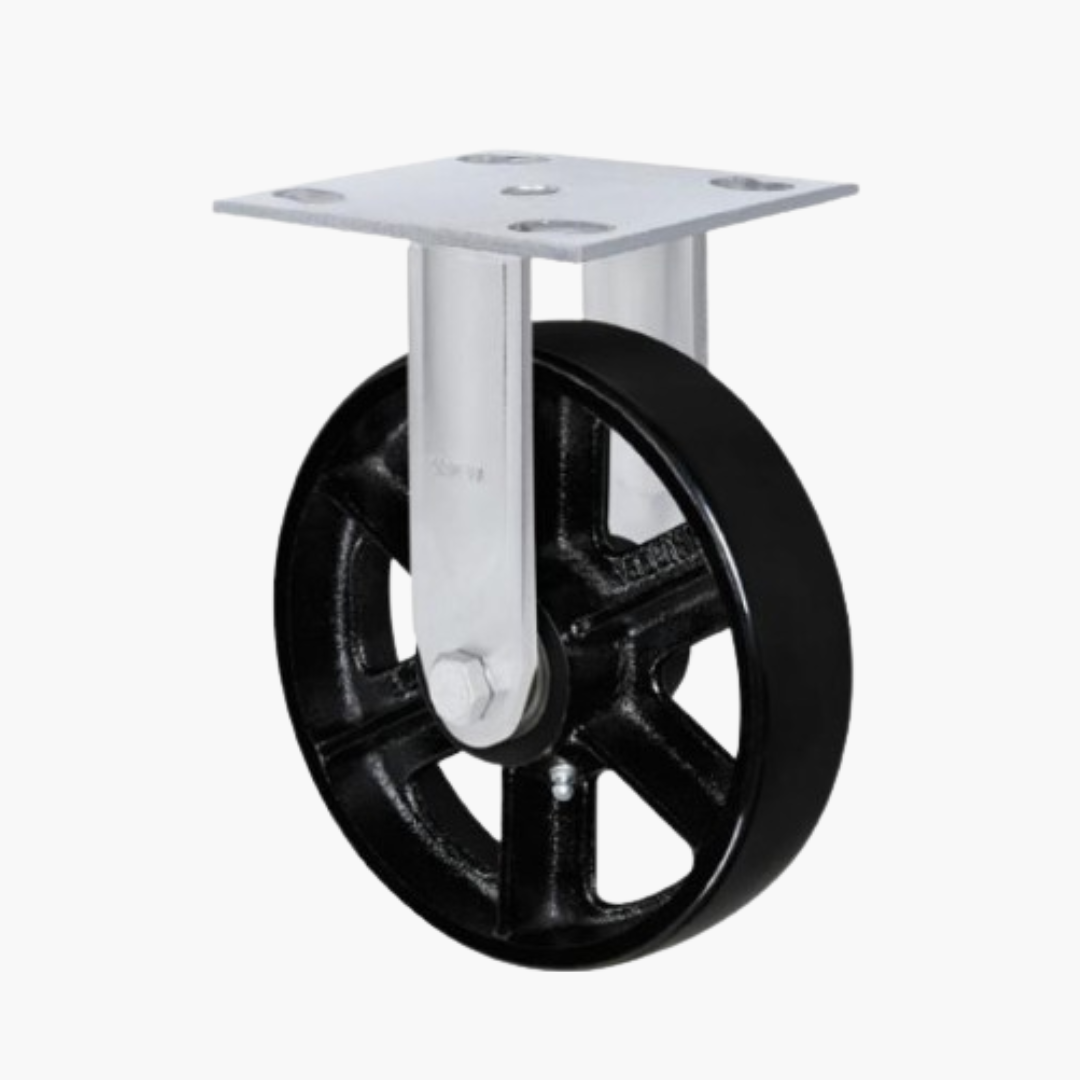 Roda F - Ferro Fundido. Dureza: 160 Brinell. (-40 a +400ºC) Produzidas com ferro fundido cinzento, rodam com muita facilidade e proporcionam grande redução do esforço de movimentação. São muito resistentes e suportam cargas e temperaturas elevadas. Não são indicadas para a utilização quando o nível de ruídos e a conservação do piso são necessários.