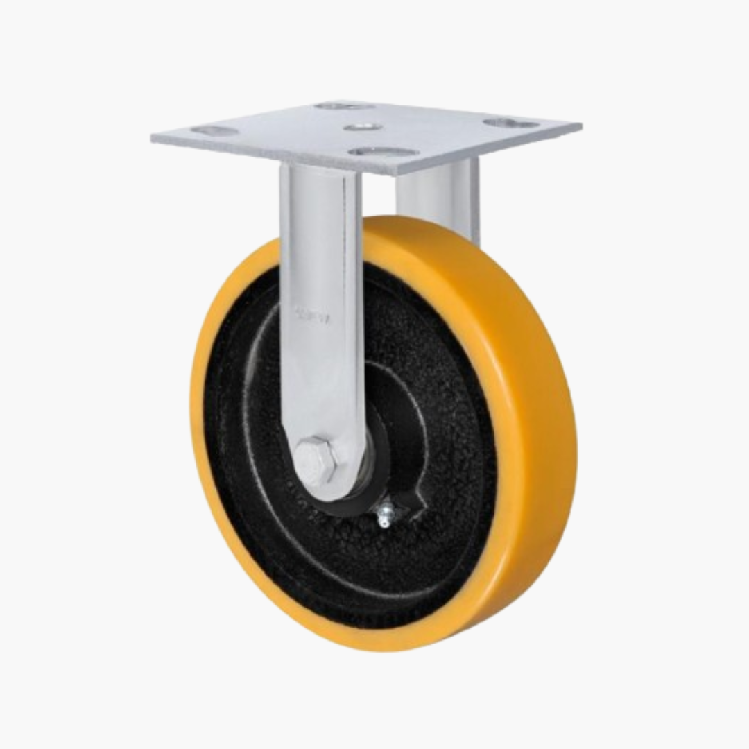 Roda P: Poliuretano Moldado. Dureza: 90 Shore A. (-40ºC a +80ºC). Produzidas com revestimento em poliuretano moldado e núcleo em ferro fundido cinzento. Ideais para aplicações nos mais diversos tipos de superfícies e ambientes. Suportam altas cargas, protegem o piso, necessitam de menor esforço para movimentação, produzem baixo nível de ruídos no deslocamento e têm excelente durabilidade. Possuem excelente resistência a abrasão, impactos, intempéries e produtos químicos como graxas, óleos, sais e solventes. Podem ser utilizadas a uma velocidade de até 4km/h.