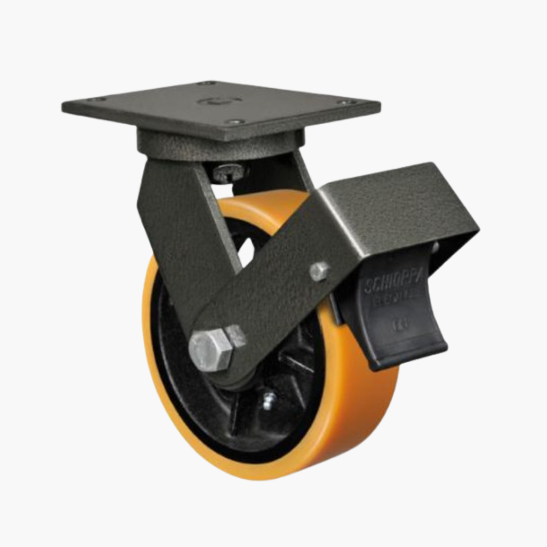 Roda P: Poliuretano Moldado. Dureza: 90 Shore A. (-40ºC a +80ºC). Produzidas com revestimento em poliuretano moldado e núcleo em ferro fundido cinzento. Ideais para aplicações nos mais diversos tipos de superfícies e ambientes. Suportam altas cargas, protegem o piso, necessitam de menor esforço para movimentação, produzem baixo nível de ruídos no deslocamento e têm excelente durabilidade. Possuem excelente resistência a abrasão, impactos, intempéries e produtos químicos como graxas, óleos, sais e solventes. Podem ser utilizadas a uma velocidade de até 20km/h quando monta.