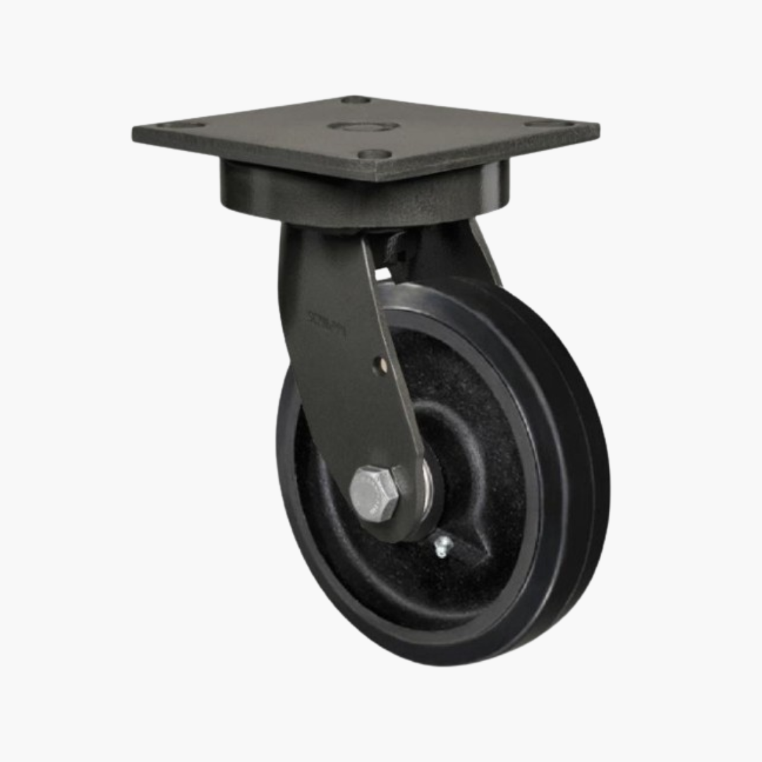 Roda B: Borracha Moldada. Dureza: 80 Shore A. (-20ºC e +70ºC). Produzidas com revestimento de borracha moldada vulcanizada em núcleo de ferro fundido cinzento. Rodam com suavidade e baixo nível de ruídos, absorvem choques e vibrações. São resistentes a abrasão e produtos químicos. Podem ser utilizadas em velocidades de até 20km/h quando montadas com rolamento de esferas.