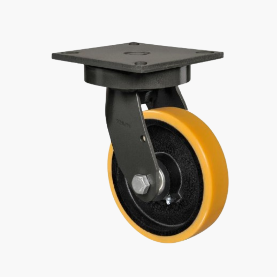Roda P: Poliuretano Moldado. Dureza: 90 Shore A. (-40ºC a +80ºC). Produzidas com revestimento em poliuretano moldado e núcleo em ferro fundido cinzento. Ideais para aplicações nos mais diversos tipos de superfícies e ambientes. Suportam altas cargas, protegem o piso, necessitam de menor esforço para movimentação, produzem baixo nível de ruídos no deslocamento e têm excelente durabilidade. Possuem excelente resistência a abrasão, impactos, intempéries e produtos químicos como graxas, óleos, sais e solventes. Podem ser utilizadas a uma velocidade de até 20km/h quando montadas com rolamento de esferas.
